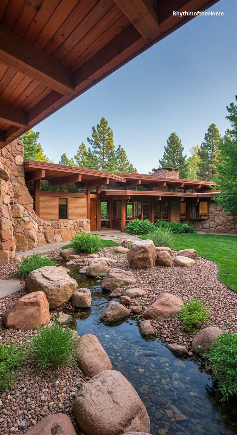 This U-shaped Mid-Century home is built around a spacious and serene central courtyard, creating a private, contemplative world within. The home’s exterior features warm, vertical wood siding and a rustic stone chimney, all united under a low-slung roof with deep overhangs. The courtyard itself is covered in smooth river gravel, with a classic, tiered stone fountain at its center providing a gentle, soothing soundtrack. Simple wooden benches are placed around the perimeter, inviting residents to relax and enjoy this tranquil, sun-dappled space that is sheltered from the outside world.