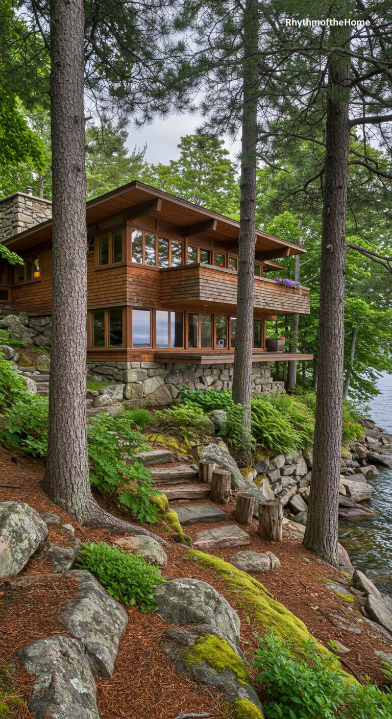 Viewed through a frame of tall pine trees, this multi-level Mid-Century home feels like a sophisticated treehouse perched on a lakeside slope. The foundation of rough-hewn stone provides a solid base for the lighter, wood-clad structure above. Cedar shingles and horizontal siding add texture and warmth, while large windows and a cantilevered deck are oriented to maximize views of the water. A rustic staircase of stone steps and log risers winds down the mossy, pine-needle-covered bank to the shoreline, reinforcing the home’s rustic yet elegant character and its deep immersion in the natural landscape.