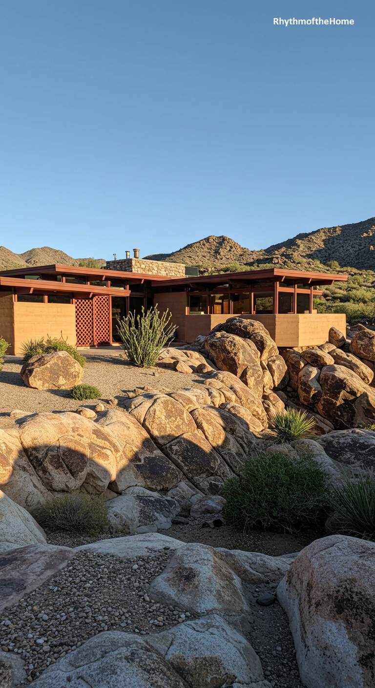 This Usonian-inspired Mid-Century home is masterfully integrated into a dramatic desert landscape dominated by massive, smooth boulders. The low, horizontal structure, with its flat roof and deep overhangs, seems to nestle amongst the rocks rather than impose on them. The walls of warm, earthy stucco and accents of decorative wood lattice complement the natural tones of the desert. Drought-tolerant plants like ocotillo and agave are carefully placed to enhance the sculptural quality of the rocks. This is a home designed in profound respect for its powerful, prehistoric-looking surroundings.