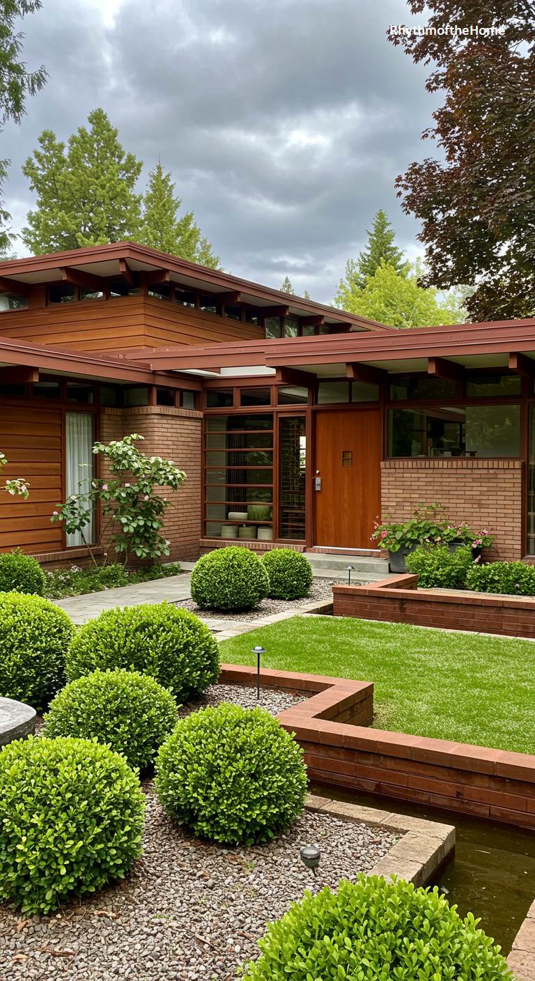 This elegant Mid-Century home showcases a beautiful fusion of modern architecture and formal landscape design. The house features a classic combination of reddish-brown brick and warm wood siding, with a multi-level, low-pitched roofline that adds visual interest. The entry courtyard is a study in clean, geometric lines, with a manicured lawn and perfectly sculpted, spherical boxwood shrubs. Raised brick planters and a small water feature further define the space, creating an orderly and serene approach to this stylish and sophisticated residence, which is surrounded by the lush greenery of mature trees.