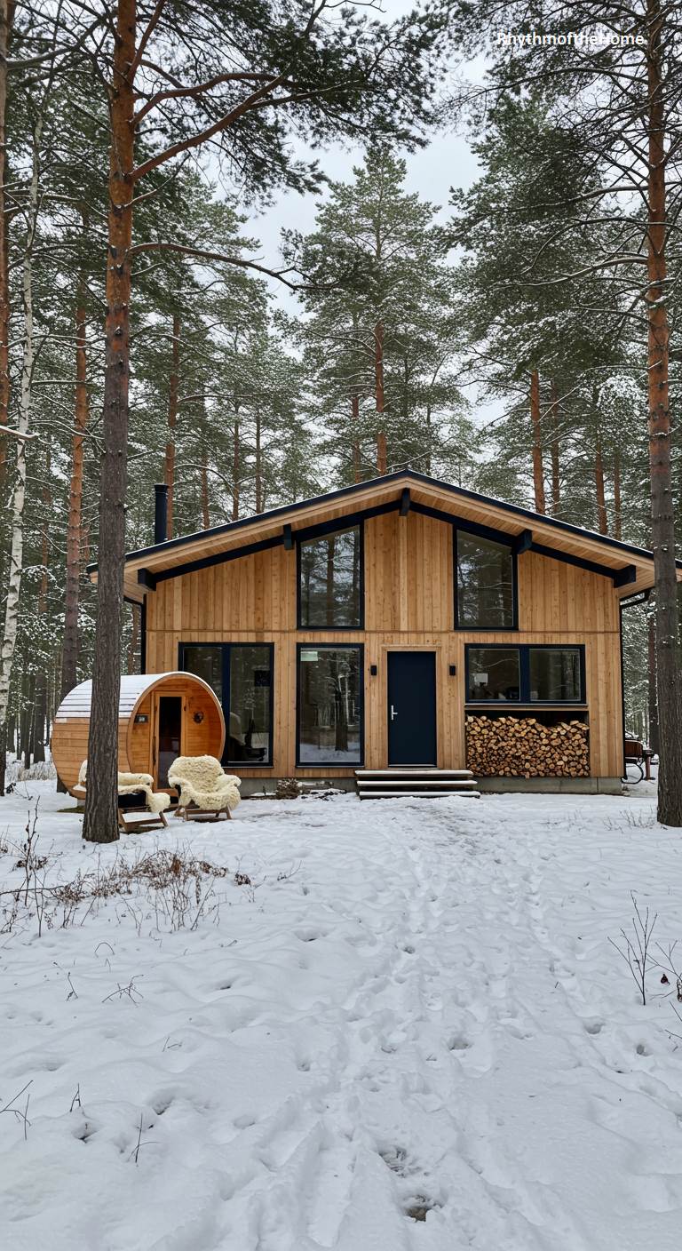 Set in a snow-covered pine forest, this A-frame Mid-Century home exudes a cozy, Scandinavian charm. The facade features light-colored, vertical wood siding, large windows to capture the winter light, and a simple, dark front door. A stack of firewood is neatly arranged, ready for the hearth. The most delightful feature is a barrel-shaped sauna just outside, promising warmth and relaxation after a day in the snow. Footprints in the fresh powder lead to the entrance, telling a story of a comfortable and hygge-filled life in this beautiful, modern woodland cabin.
