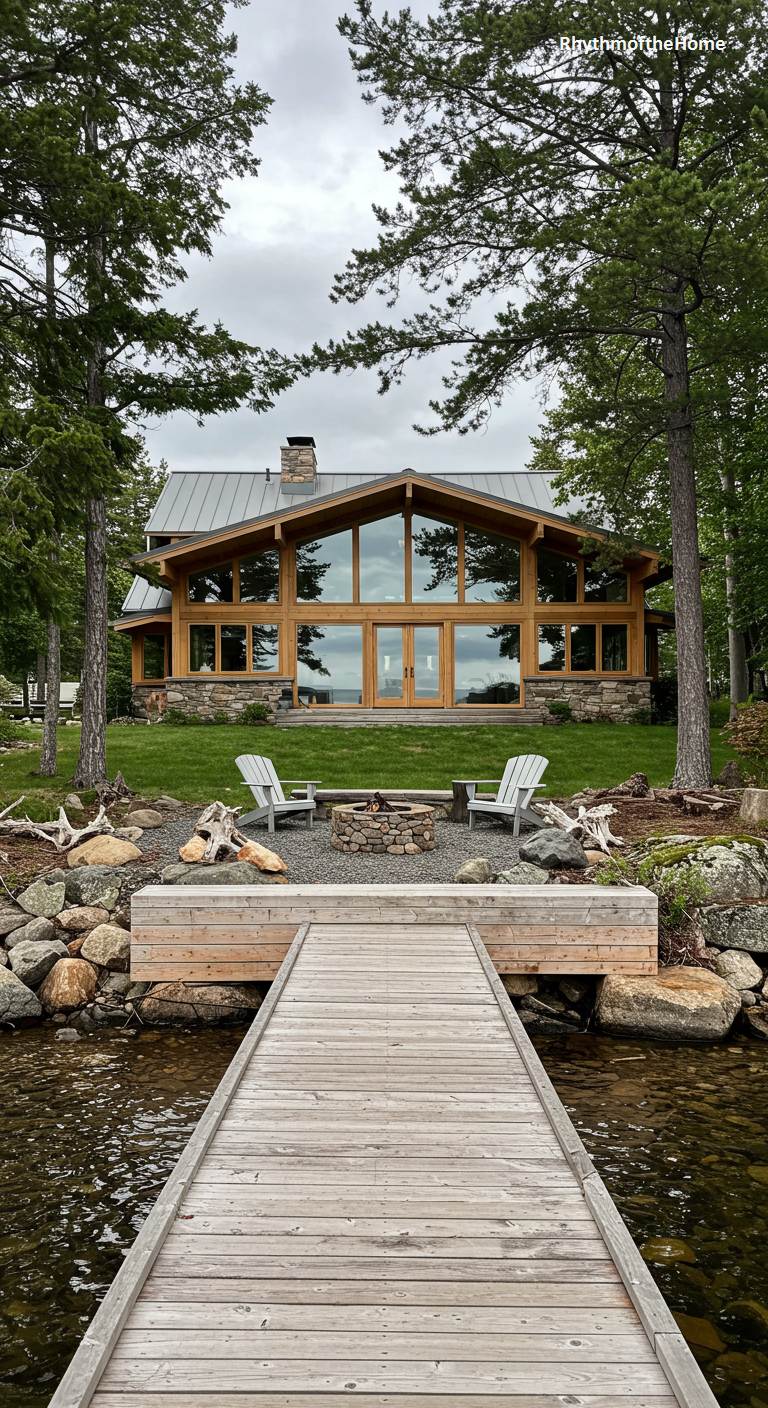 This impressive A-frame Mid-Century home stands proudly on a grassy lawn overlooking a calm lake. A simple wooden dock extends from the shore, leading the eye directly to the home’s grand, symmetrical facade. The wall of glass at the front, framed by the soaring roofline, is designed to capture the maximum amount of light and the full expanse of the water view. Natural stone forms the foundation, grounding the light, wooden structure. A pair of Adirondack chairs around a fire pit on the gravel shore offers the perfect vantage point to enjoy this idyllic, modern lakeside retreat.