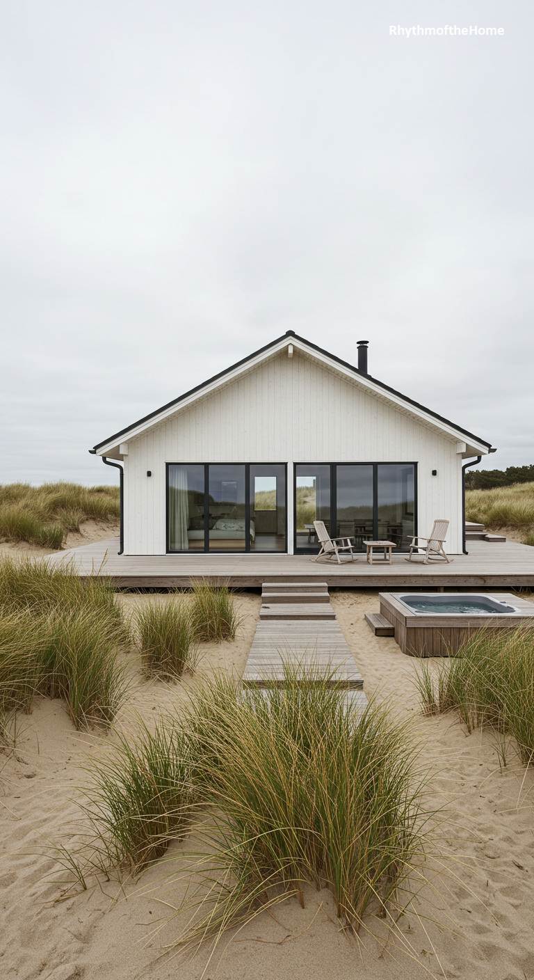 This modern Scandinavian-inspired Mid-Century home is the epitome of beachside simplicity and elegance. The structure is a clean-lined, gabled form with crisp white vertical siding and contrasting black trim around the large windows and doors. It rests on a simple wooden deck that extends into the surrounding sand dunes, creating a seamless transition to the natural landscape. A small, built-in hot tub offers a luxurious touch. The landscaping consists of native beach grasses, allowing the home to sit lightly and respectfully in its beautiful, windswept coastal environment under an overcast sky.