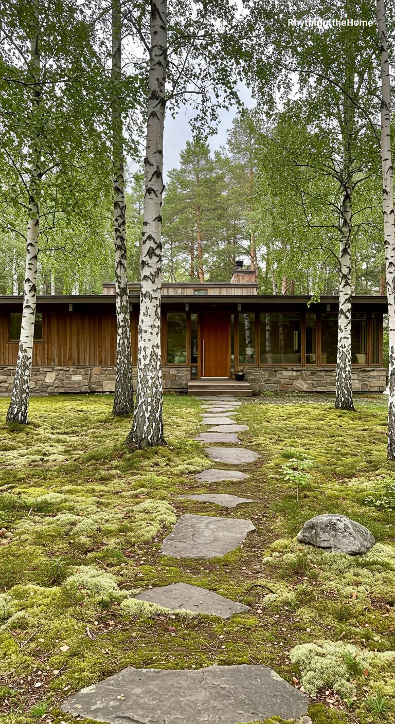 A meandering path of irregular flagstones winds through a beautiful grove of white-barked birch trees, leading to this serene Mid-Century home. The house itself is a classic example of the style, with a low, horizontal profile, warm wood siding, a fieldstone foundation, and a central chimney. The ground is a carpet of soft, pale green moss, enhancing the tranquil, almost magical quality of the setting. The home seems perfectly at one with its surroundings, a quiet, warm retreat nestled within the delicate beauty of the birch forest. This is architecture as a quiet participant in nature.