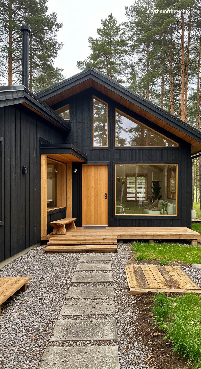 This contemporary cabin offers a bold, modern take on Mid-Century design principles. The exterior is clad in striking, black-stained vertical wood, which creates a dramatic, minimalist silhouette against the pine forest. This dark facade is beautifully contrasted by the warm, natural tones of the wooden deck, steps, and the recessed entryway with its light wood door. Large, strategically placed windows, including angular panes that follow the roofline, promise a light-filled interior and a strong connection to the surrounding nature. The use of simple, honest materials gives this home a powerful and sophisticated presence.