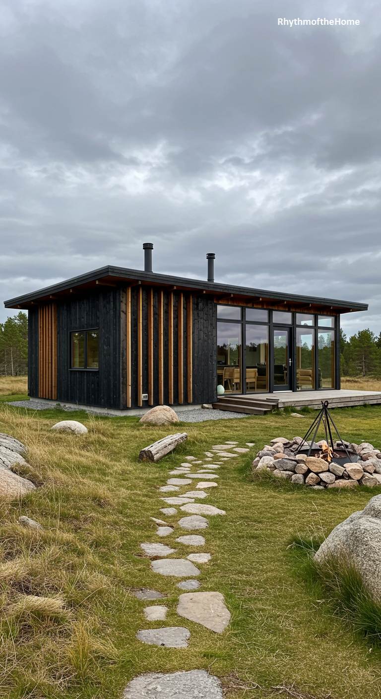 This compact and stylish Mid-Century inspired cabin is a perfect example of efficient, modern design. The exterior is a handsome combination of black siding and vertical, natural wood slats that add a rhythmic, textural element. A simple, flat roof and large glass windows and doors give it a classic modernist feel. The home is set in a wide, open landscape of grass and low-lying shrubs, with a stone-lined fire pit and a winding flagstone path. The overall impression is one of chic, minimalist living, perfectly suited for a rural or semi-wild setting under a dramatic, cloudy sky.