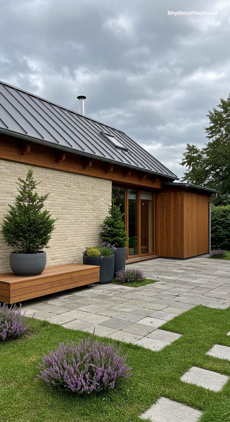 This single-story home showcases the clean lines and warm minimalism of Scandinavian-influenced Mid-Century design. The facade features a beautiful contrast between light-colored, elongated bricks and a recessed section of warm, vertical wood siding. A dark metal roof adds a modern touch. The landscaping is understated and elegant, with a built-in wooden bench, large modern planters containing small evergreens, and patches of purple heather. The paver patio and paths are laid out in a clean, geometric pattern, reflecting the home’s ethos of simple, functional, and natural beauty.