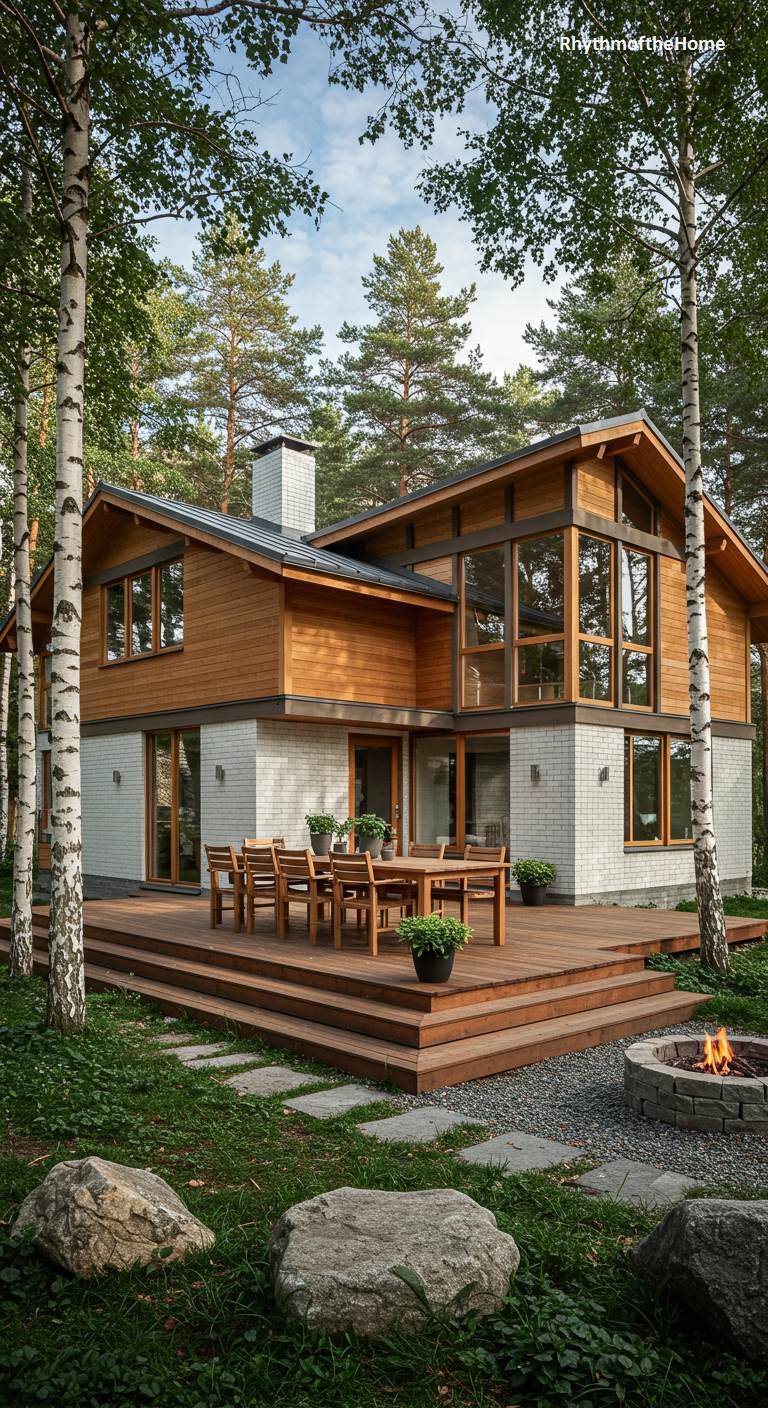 This handsome two-story Mid-Century home is a beautiful composition of contrasting materials and forms, nestled among slender birch trees. The lower level is constructed from clean, white-painted brick, providing a solid, bright base. The upper level is clad in warm, horizontal wood siding, creating a pleasing textural and color contrast. A large, multi-level wooden deck with a dining set extends the living space into the outdoors, perfect for entertaining. A stone fire pit on a gravel bed promises cozy evenings under the stars in this stylish and welcoming woodland setting.