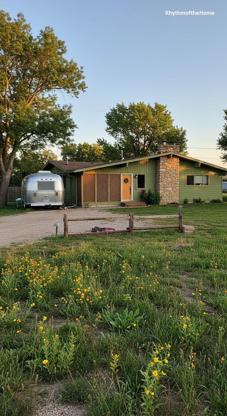 With an Airstream trailer parked casually in the gravel driveway, this sage-green Mid-Century ranch home radiates a sense of laid-back, rustic cool. The home’s modest, single-story design features a low-pitched roof, a prominent stone chimney, and a decorative wooden screen that adds texture and privacy to the entrance. It’s perfectly situated in a bucolic landscape, surrounded by mature trees and a meadow of yellow wildflowers. A simple split-rail fence completes the picture, creating an unpretentious and inviting homestead that celebrates the beauty of simple living and the open road.