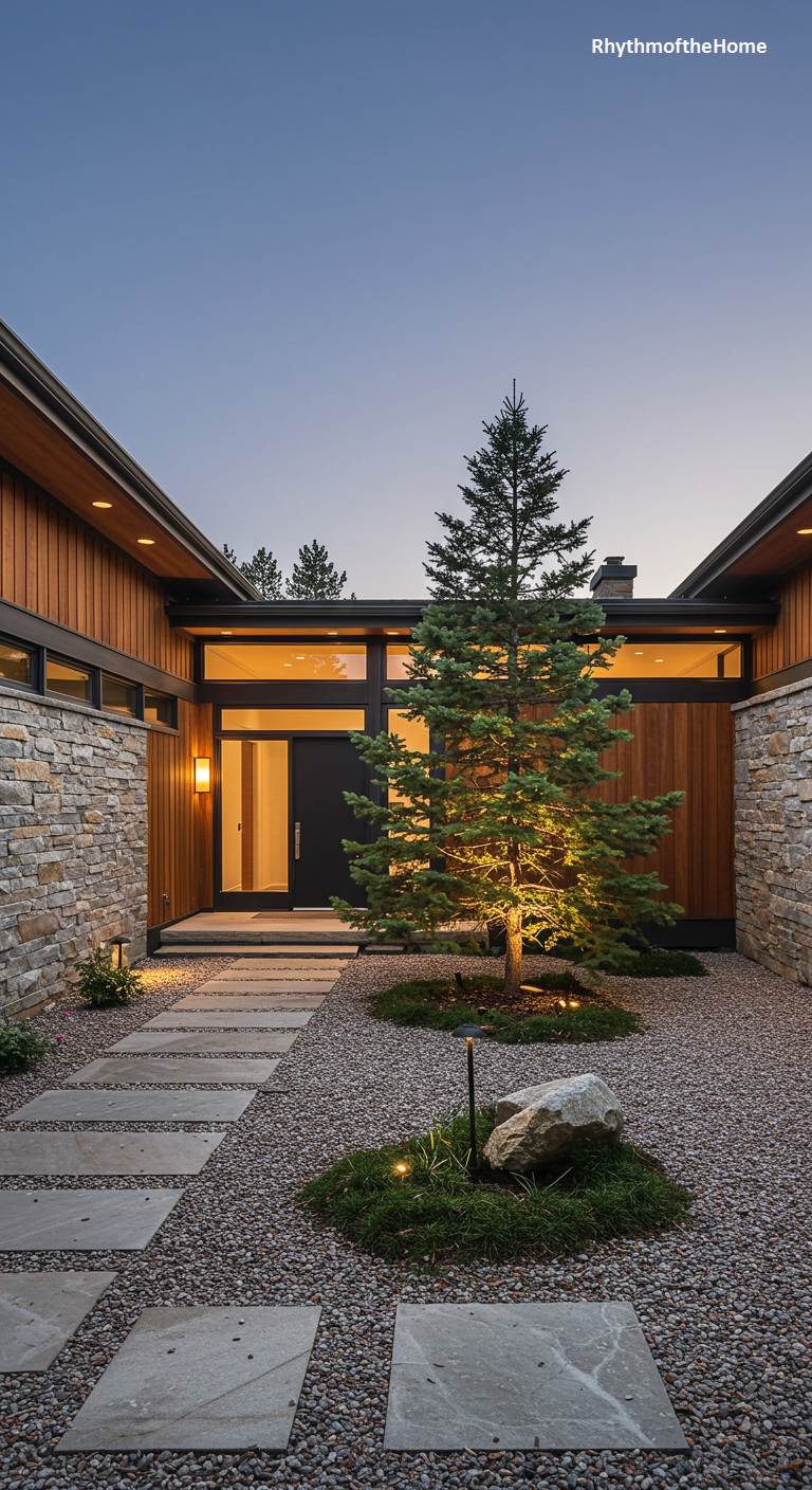 This U-shaped Mid-Century home creates a stunning and serene entrance courtyard that immediately establishes a connection with nature. The walls of warm wood and rough-hewn stone form a sheltered embrace around a central, beautifully shaped pine tree. The ground is covered in fine gravel, with a path of rectangular stone pavers leading to the dark, modern front door. Uplighting on the tree makes it a dramatic focal point, especially as dusk settles. Clerestory windows above the entrance promise a light and airy interior, perfectly balancing privacy and openness.