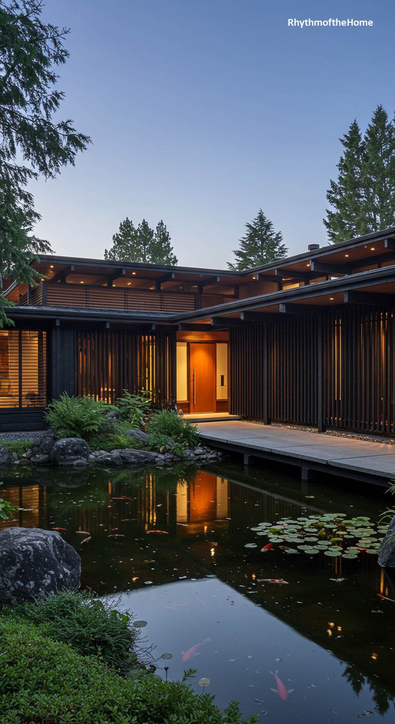 At dusk, this Japanese-inspired Mid-Century home becomes a magical, glowing retreat. The structure, with its dark wood, vertical slats, and low-pitched rooflines, is organized around a stunning koi pond. Warm interior light reflects beautifully on the water’s surface, where vibrant orange koi swim gracefully among lily pads. A simple wooden bridge crosses a section of the pond, leading towards a warmly lit entrance. The lush, surrounding garden with its ferns and rocks adds to the profound sense of serenity. This is a home where architecture, water, light, and life are woven together into a harmonious whole.