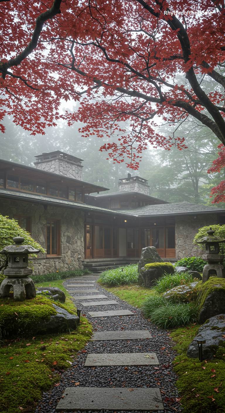 This sprawling stone and wood Mid-Century home achieves a breathtaking beauty through its integration with a Japanese-style garden. The scene is dominated by a magnificent Japanese maple tree with fiery red leaves, its branches creating a stunning natural canopy over the entrance. The house, with its multiple stone chimneys and low-profile rooflines, feels grounded and organic. A path of dark, rectangular pavers set in gravel winds through a landscape of moss-covered rocks and manicured shrubs. The misty, atmospheric conditions enhance the serene, almost mystical quality of this exceptional property.