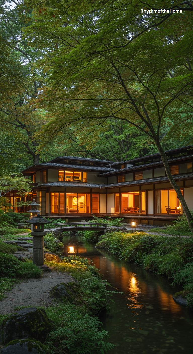 This enchanting multi-level Mid-Century home evokes the timeless beauty of a traditional Japanese ryokan (inn). The sprawling wooden structure, with its paper-like screens and multiple rooflines, is nestled in a lush, green forest. A gentle stream flows through the property, crossed by a delicate arched wooden bridge. At night, the warm glow from the interior windows and strategically placed garden lanterns illuminates the scene, reflecting in the moving water and highlighting the stone pathways. This is an idyllic and romantic vision of harmonious living, where every element contributes to an atmosphere of profound peace.