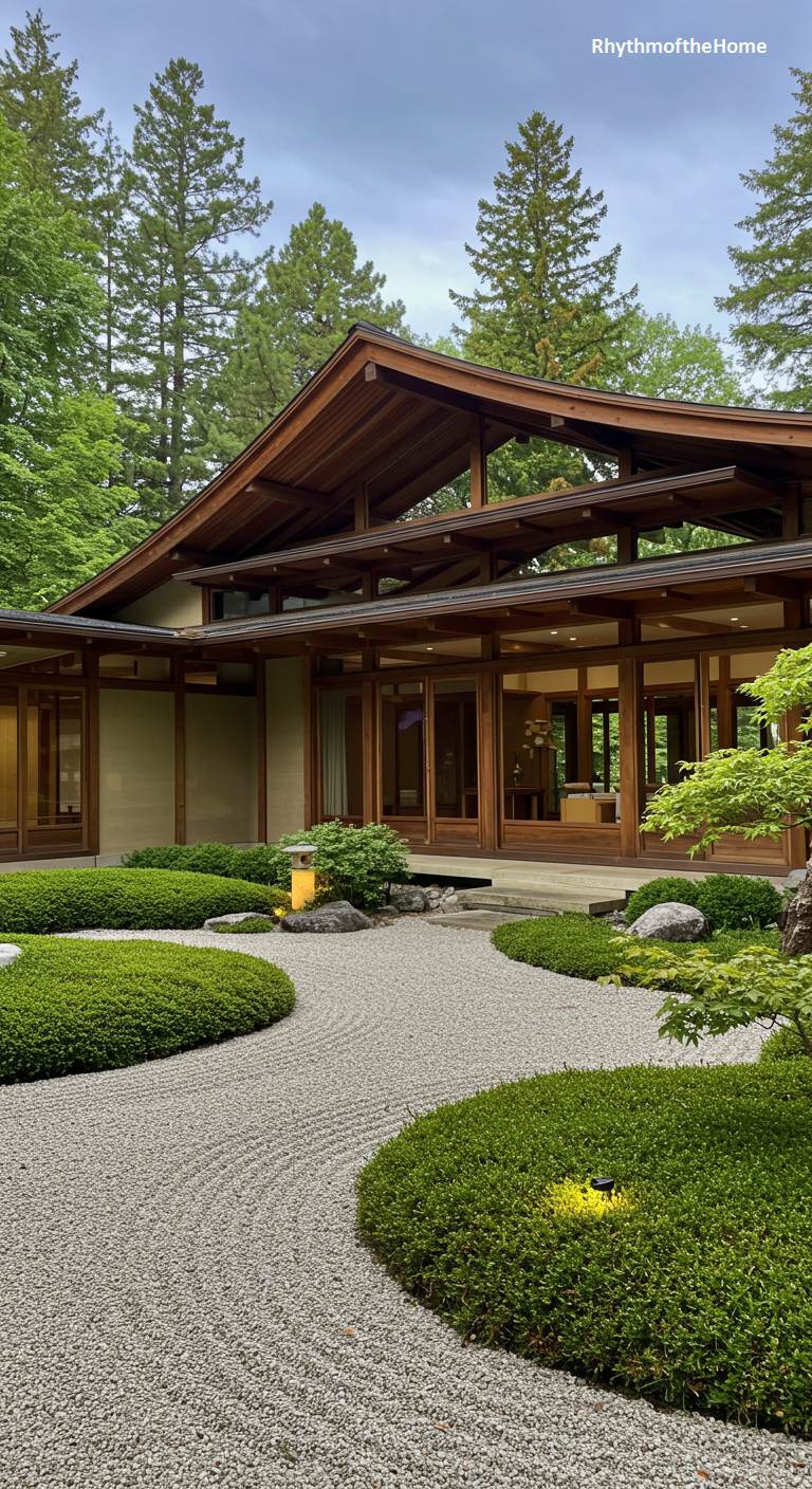 This beautifully designed Mid-Century home showcases a perfect marriage of modern architecture and Japanese garden principles. The structure itself is a classic of the style, with post-and-beam construction, large glass walls, and a dynamic, multi-level roofline. The surrounding landscape is a serene composition of raked gravel, manicured, curving hedges of boxwood, and carefully placed rocks. A single lantern-style light adds an authentic touch. The garden’s clean, flowing lines beautifully complement the home’s geometry, creating a space that is both visually stunning and deeply peaceful.