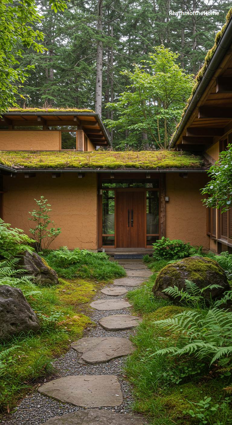 This unique Mid-Century home has a profoundly organic and earthy feel, thanks to its walls of what appears to be rammed earth or adobe-style stucco. The warm, terracotta color of the walls is complemented by a dark wood-framed entrance and a living green roof covered in moss. A winding path of rustic flagstones leads through a lush, naturalistic garden filled with ferns and mossy boulders. The house seems to emerge from the forest floor, a testament to an architectural philosophy that seeks to build with, rather than on, the land.