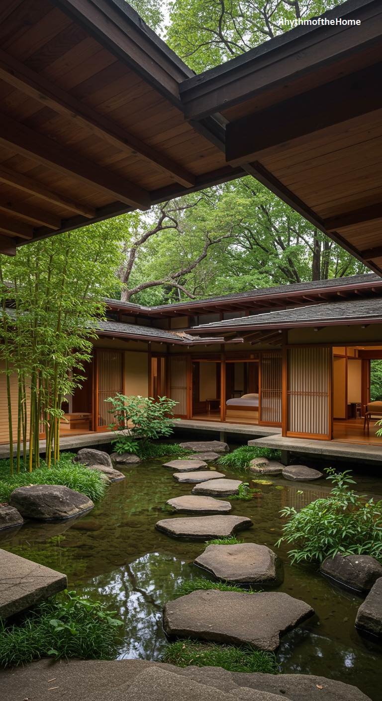This incredible Mid-Century home creates a magical experience by integrating a water feature directly into its courtyard. A series of large, irregular stepping stones forms a path across a shallow pond, leading from one part of the house to another. The home itself, influenced by Japanese design, features wood construction and sliding screens, all sheltered under a deep, overhanging roof that opens to the sky in the center. Bamboo and other water-loving plants grow in and around the pond, creating an immersive, multi-sensory environment that is both playful and profoundly serene.