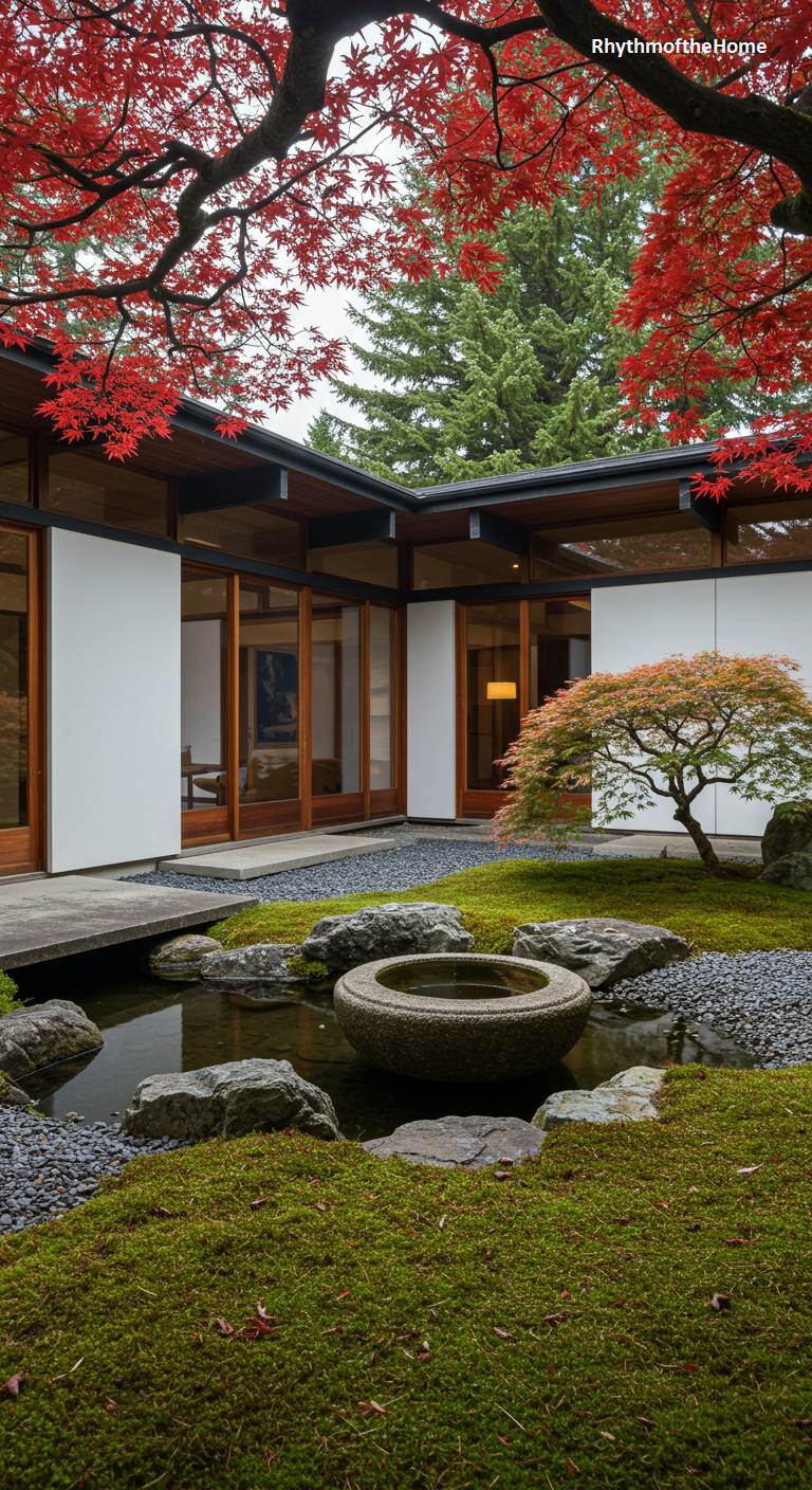 This U-shaped Mid-Century home, with its clean white walls and wood-trimmed glass panels, creates a perfect frame for a stunning Japanese moss garden. The courtyard is a vibrant, textured carpet of green, accented by carefully placed rocks and a beautiful, small Japanese maple tree. A simple concrete bridge crosses a dry creek bed of dark pebbles, leading to a traditional stone water basin (tsukubai). This is a space of immense tranquility and beauty, where the principles of modernism and ancient garden design come together in perfect, quiet harmony under the branches of a fiery red maple.