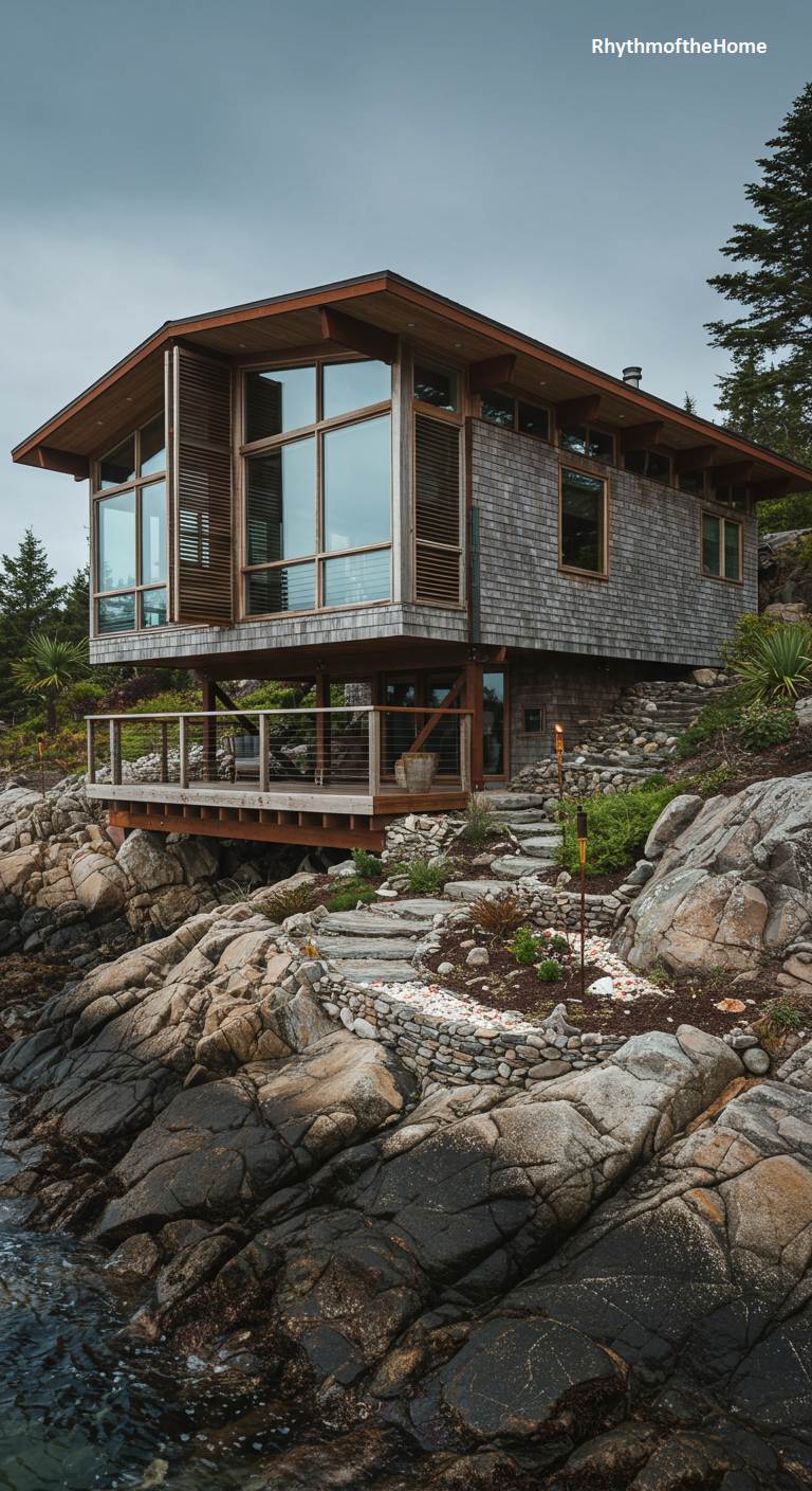 Clinging to a rugged, rock-strewn shoreline, this remarkable Mid-Century home is a testament to architecture that respects its environment. The house is elevated on stilts, allowing the natural, dramatic terrain to flow uninterrupted beneath it. The exterior is clad in weathered cedar shingles that echo the muted tones of the surrounding stone and forest. Large windows are strategically placed to capture breathtaking water views, while louvered wooden shutters offer both privacy and textural interest. A set of stone steps winds down the rocky outcrop, connecting the dwelling directly to the elemental beauty of the coast.