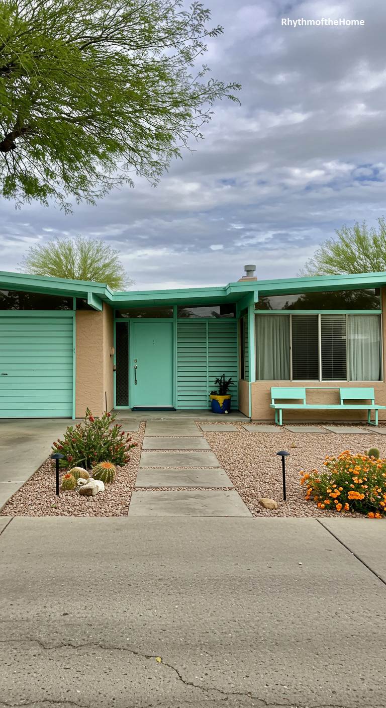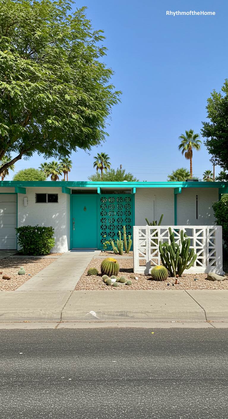 This classic desert ranch is a vibrant oasis of Mid-Century style. The home’s stucco walls are a warm sand color, providing the perfect neutral base for the dazzling turquoise trim that adorns the roofline, windows, and front door area. A decorative breeze block screen, also painted turquoise, adds iconic texture and pattern. The landscaping is a naturalistic xeriscape of gravel, rocks, and desert-adapted plants like agave. A built-in turquoise bench by the entrance offers a shady spot to relax, completing this vision of colorful, retro desert living.