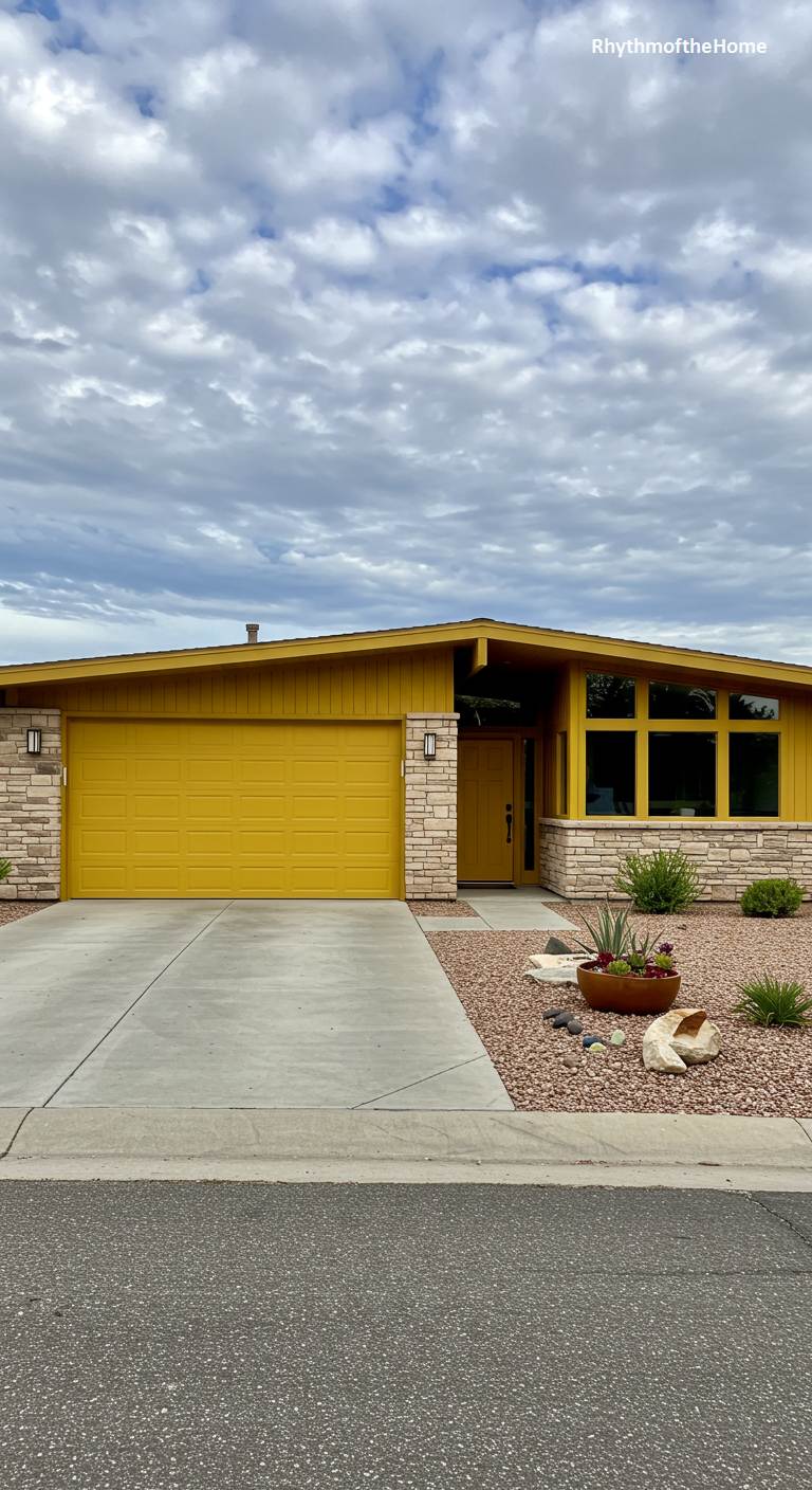 This stylishly updated Mid-Century home makes a cheerful and confident statement. The facade is a handsome combination of stacked stone and vertical wood siding, painted a vibrant mustard yellow. The garage door and front door are painted to match, creating a bold, monochromatic look that is both playful and sophisticated. The low-pitched roof and clerestory windows are classic features of the era. The landscaping is a simple, drought-tolerant mix of reddish gravel, rocks, and desert plants, allowing the home’s striking color and architecture to be the main attraction.
