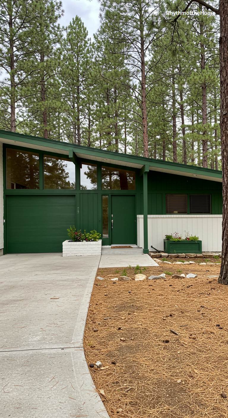 Nestled amongst tall pine trees, this Mid-Century home is painted a deep, rich forest green that allows it to merge beautifully with its woodland surroundings. The angled roofline and clerestory windows are iconic design elements, adding architectural interest. A low, white-painted brick planter and wall section provide a crisp point of contrast to the dark green facade. The landscaping is natural and low-maintenance, with pine needles covering the ground, reinforcing the home’s identity as a stylish and modern cabin in the woods.