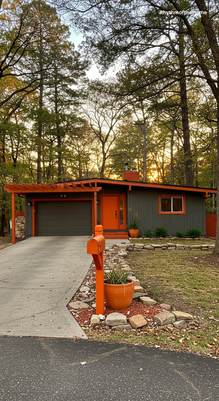 This Mid-Century home makes a bold, confident statement with its striking color palette. The deep charcoal gray of the vertical siding provides a sophisticated, modern backdrop for the electrifying pops of vibrant orange. An architecturally distinct pergola extends from the garage, its vivid hue echoed in the window trim and the welcoming front door, creating a cohesive and graphically pleasing composition. This is a dwelling that isn’t afraid to showcase its personality, transforming a classic suburban form into a memorable piece of design with immense curb appeal, especially as the setting sun warms the scene.