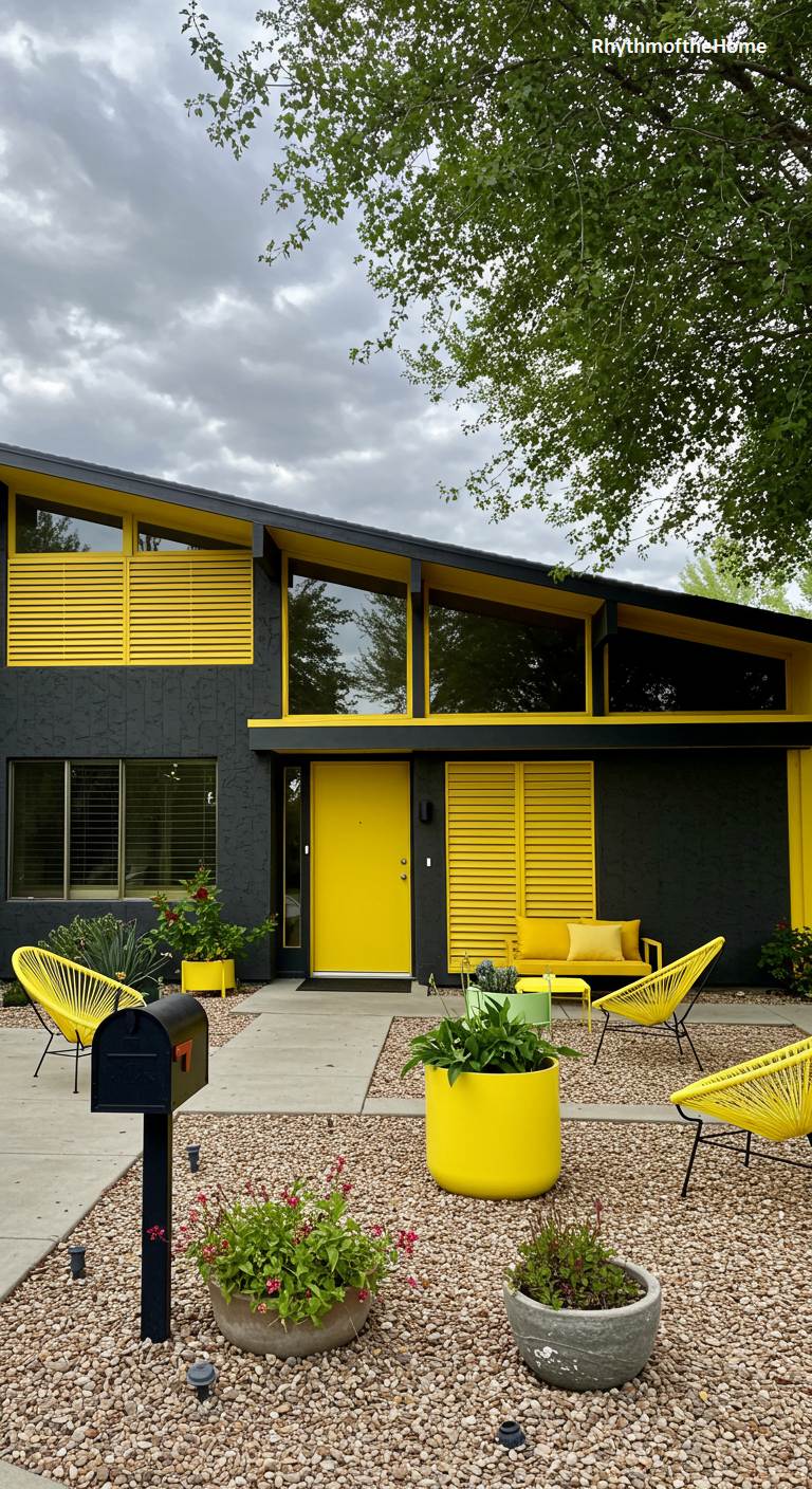 This Mid-Century home is a stunning example of high-contrast, high-impact design. The entire house is painted a dramatic, deep black, which makes the brilliant, lemon-yellow accents pop with incredible energy. The yellow is used on the louvered screens, the front door, and the outdoor furniture, creating a cohesive and electrifying theme. The bright yellow chairs and planters in the gravel yard turn the front of the house into a stylish, open-air living space. This is a bold, fearless, and unforgettable take on modern design.