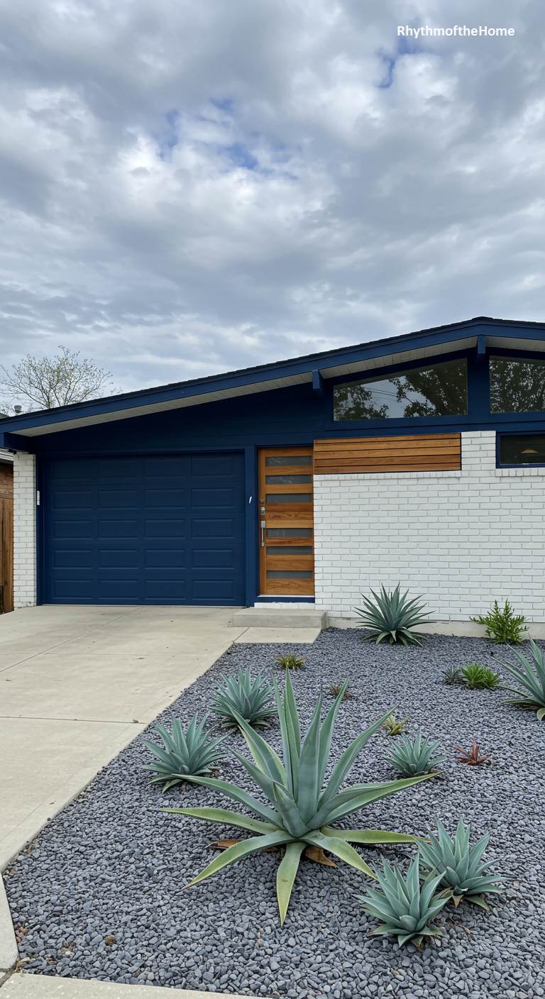 This renovated Mid-Century home achieves a crisp, almost nautical-inspired look with its clean color palette. The facade combines white-painted brick with a deep navy blue on the garage door and roof fascia. A section of warm, horizontal wood siding above the front door adds a touch of organic texture and warmth. The landscaping is modern and minimalist, featuring a bed of dark gray gravel planted with sculptural, silvery-blue agave plants. The result is a sharp, sophisticated, and contemporary update to a classic architectural style.