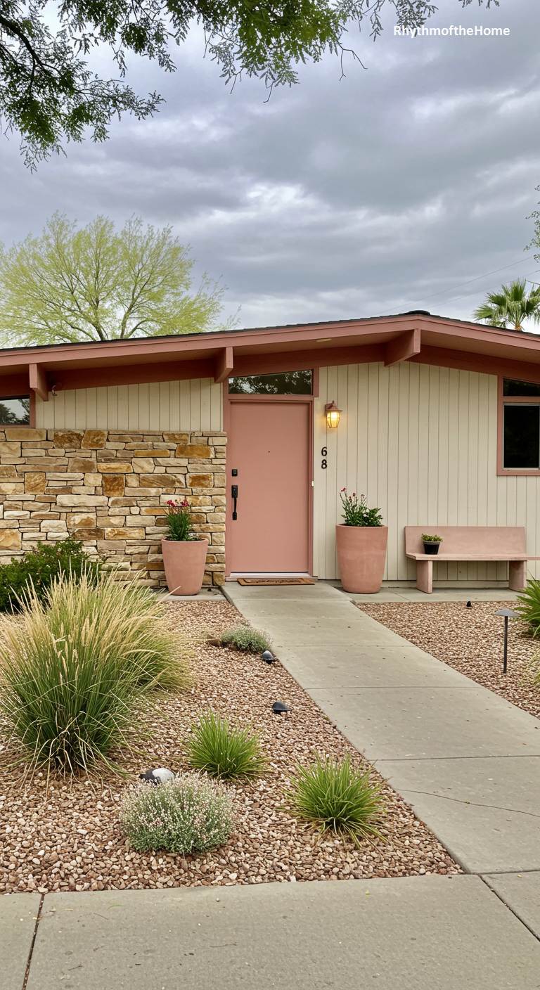 This charming Mid-Century ranch features a soft and inviting color palette. The vertical siding is a creamy off-white, while the trim and front door are painted a lovely, dusty rose pink. This warm, subtle color is echoed in the matching planters that flank the entrance. A wall of rustic, textural stone veneer grounds the design and adds a touch of organic character. The landscaping is a simple, drought-tolerant mix of gravel and ornamental grasses, creating a low-maintenance and welcoming front yard that is both gentle and stylish.
