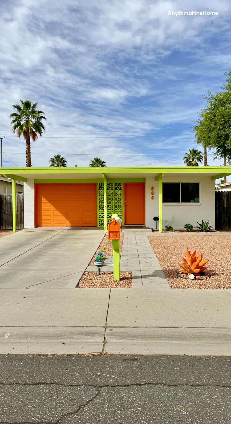 This classic Palm Springs Mid-Century home is a celebration of joyful, vibrant color. The main body of the house is clean white brick, providing the perfect canvas for the brilliant orange accents on the garage door, front door, and roof fascia. A decorative breeze block screen, painted a zesty lime green, adds another layer of retro fun and visual interest. The landscaping is a simple mix of gravel and low-maintenance plants, allowing the home’s exuberant color scheme to be the star of the show. An orange mailbox completes this picture of sunny, optimistic design.