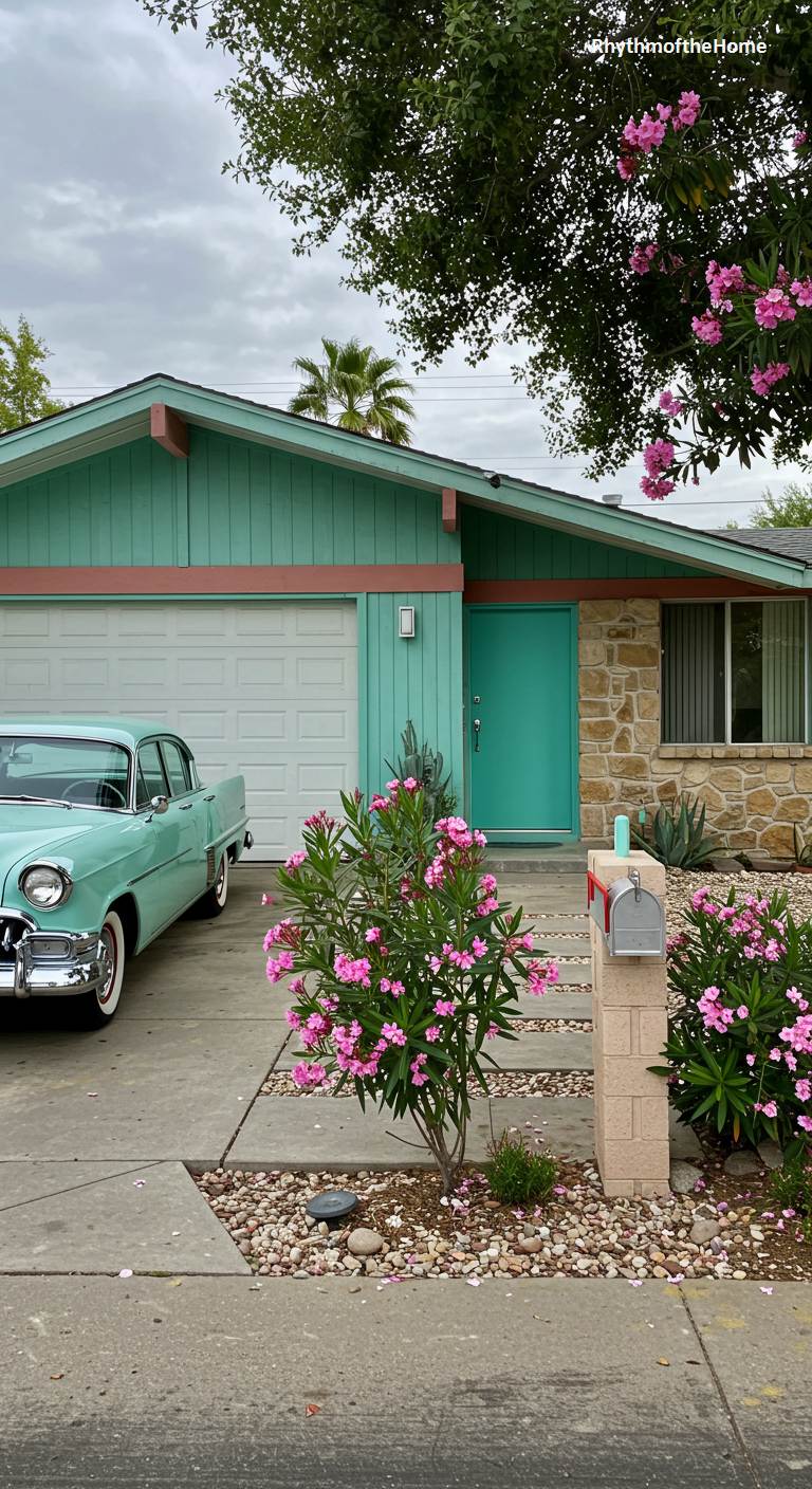 This charming Mid-Century ranch is a delightful throwback to a more colorful era. The exterior is painted a cheerful seafoam green, with the front door and gable trim providing a vibrant, contrasting turquoise accent. A section of rustic, honey-toned stone veneer adds texture and grounds the otherwise whimsical color scheme. Parked in the driveway, a classic vintage car in a matching seafoam hue completes the perfectly curated, retro-chic tableau. Flowering oleander bushes and simple, low-maintenance landscaping add to the home’s unpretentious and joyful curb appeal under a cloudy sky.