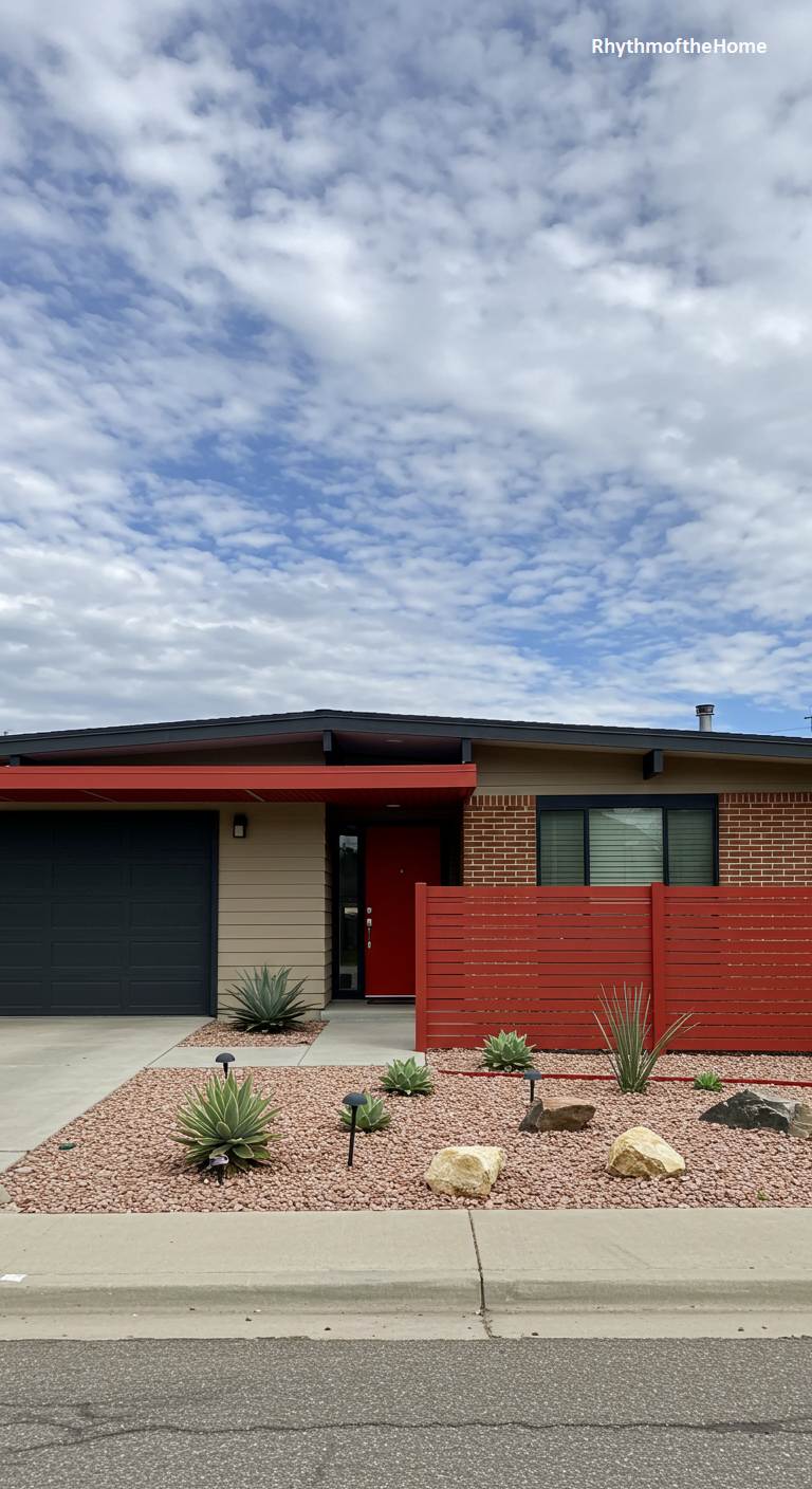 This single-story Mid-Century home offers a sophisticated and contemporary color scheme. The main body of the house combines tan siding with brick accents, grounded by a dark gray garage door. The design is given a powerful punch of personality with a bright red front door and a matching red slat-wood fence that encloses a small front patio. The low-pitched roof and clean lines are classic to the style. The xeriscaped yard with its reddish gravel, rocks, and agave plants perfectly complements the color palette, creating a cohesive and modern look.