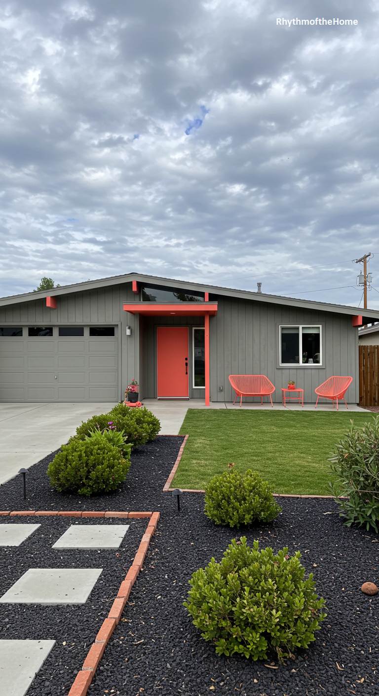 This updated Mid-Century ranch showcases a stylish and contemporary aesthetic. The main body of the house is painted a modern, neutral gray, which provides a cool and sophisticated backdrop. The design is brought to life with a vibrant, coral-pink accent color on the front door and the clean-lined entryway overhang. This pop of color is playfully echoed in the modern outdoor seating. The landscaping is minimalist and graphic, with black lava rock, square pavers, and neatly trimmed shrubs, creating a sharp and polished curb appeal.