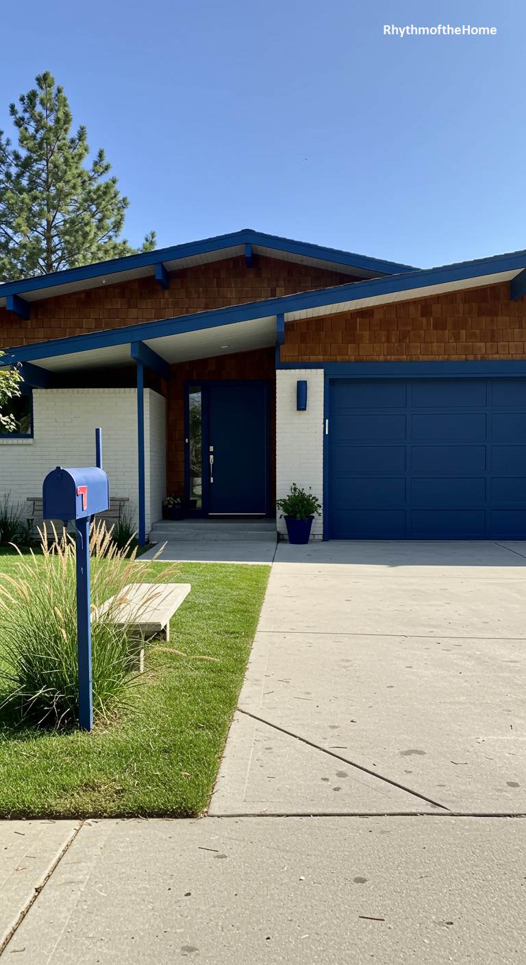 This Mid-Century home has a strong and stately presence, thanks to its bold, royal blue accents. The house combines white-painted brick with warm, brown cedar shingles, a classic textural pairing. The deep blue is used on the garage door, the modern front door, and the posts of the entryway, creating a cohesive and striking theme. A matching blue mailbox stands by the curb. The simple landscaping of lawn and ornamental grass allows the powerful color and architectural details to command attention.