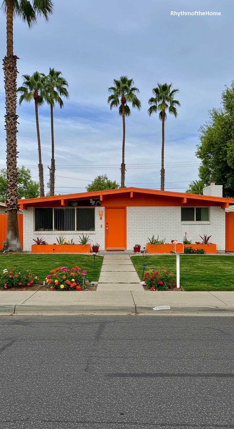This cheerful Mid-Century home radiates warmth and sunny optimism, looking like a delightful orange creamsicle. The house is built of white brick, providing a bright, clean canvas. The roof fascia, window frames, front door, and even the planters are all painted a vibrant, happy shade of orange. Tall palm trees in the background firmly place this home in a sun-drenched locale like Florida or California. The lush green lawn and colorful rose bushes in the foreground complete this picture of a bright and welcoming suburban dream.