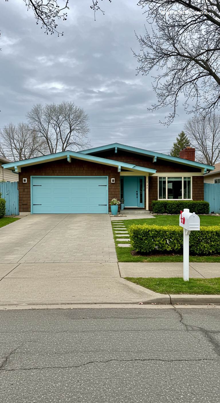 This charming Mid-Century ranch features a friendly and appealing color palette. The main body of the house is clad in natural, warm-brown cedar shingles, which are beautifully complemented by the sky-blue accents on the garage door, front door, and entryway trim. A classic red brick chimney adds another touch of color and texture. The landscaping is neat and traditional, with a manicured lawn and tidy evergreen hedges. A white mailbox stands by the curb, completing this picture of a well-loved, classic American suburban home.