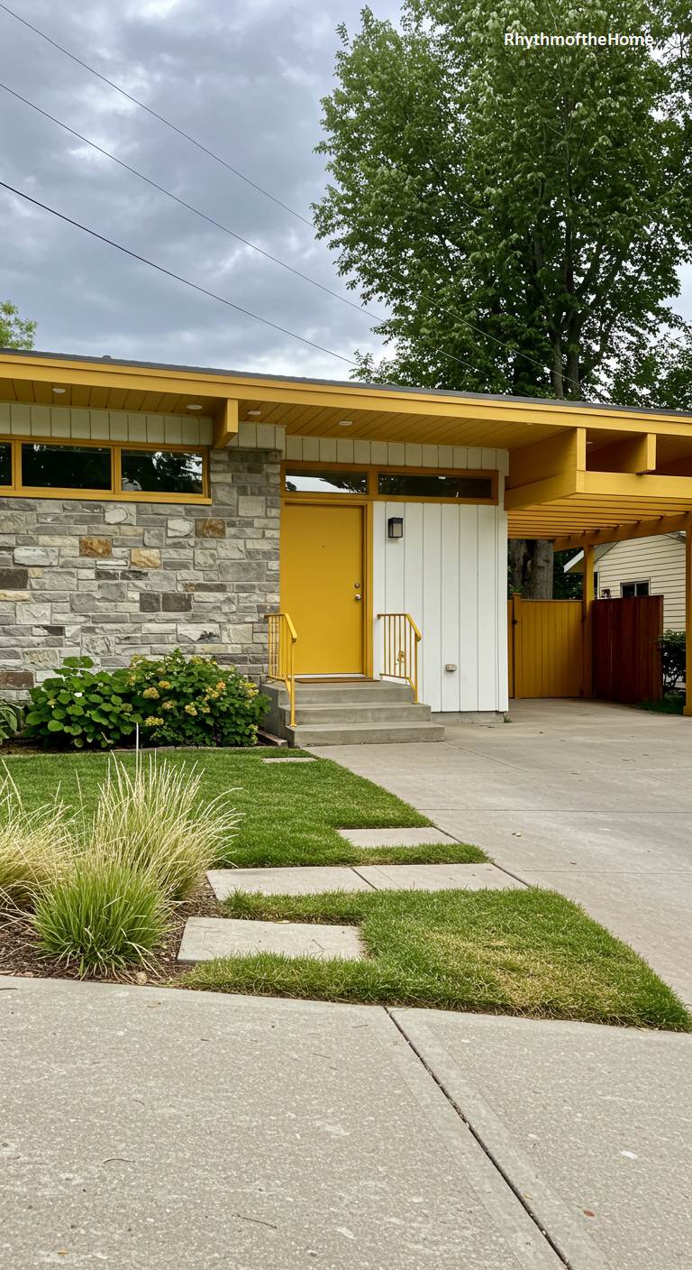 This Mid-Century home is a ray of sunshine with its cheerful yellow accents. The design combines a beautiful, textural stone veneer wall with clean white vertical siding. A bright, sunny yellow is used for the carport structure, the railing, and the front door, injecting a dose of playful energy into the facade. The landscaping creatively uses pavers set into the lawn to create a staggered, geometric path to the front steps. This is a home that balances natural, rustic materials with a bright, modern sensibility.