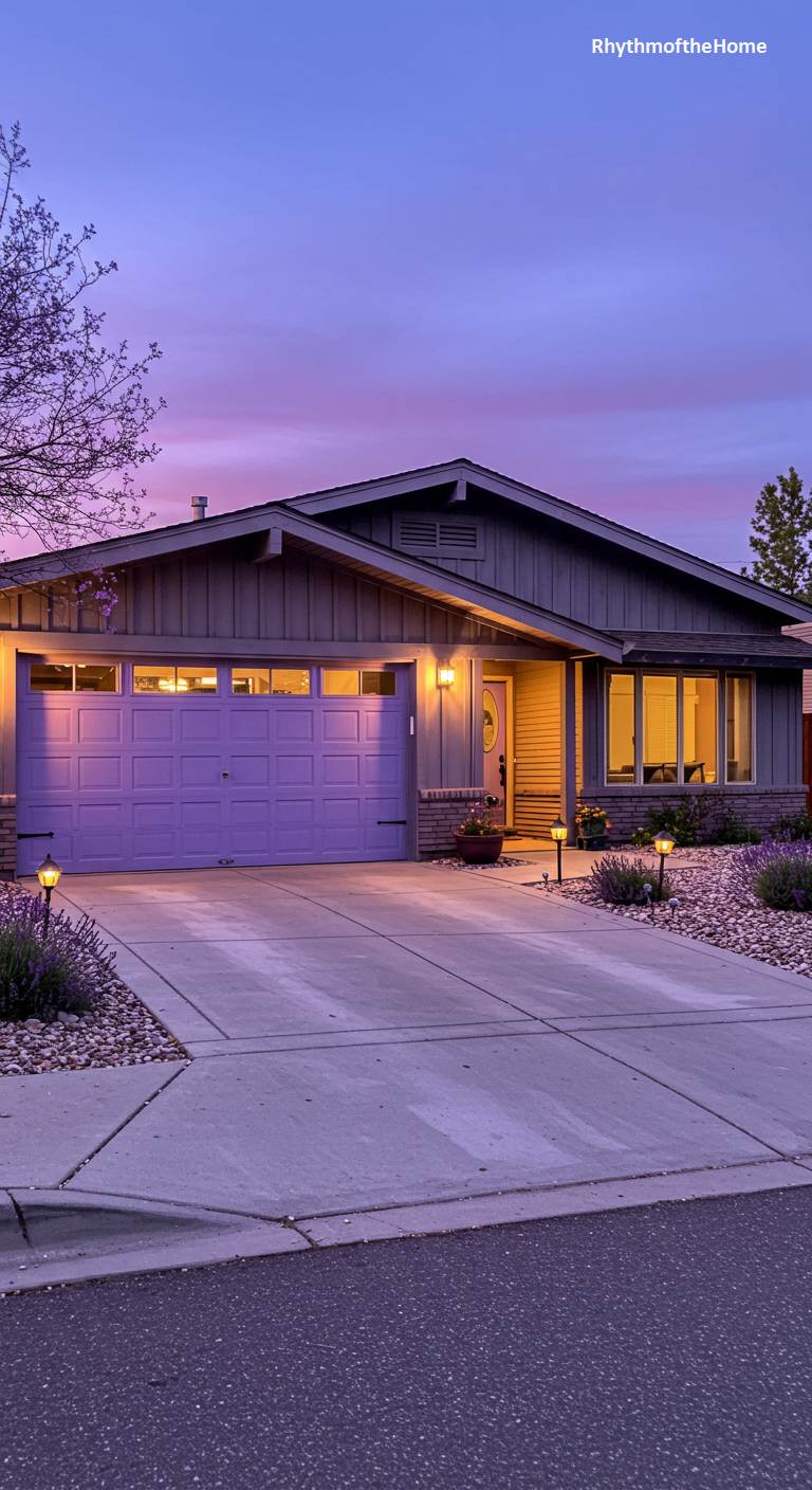 As a dramatic, purple-hued twilight sky settles in, this modest ranch-style home takes on a magical glow. The ambient light casts a soft lavender sheen over the entire scene, from the house to the driveway. The warm lights from within the house and the landscape lights lining the walkway add to the enchanting atmosphere. The yard, with its gravel beds and lavender plants, seems to perfectly complement the colors of the sky. This image captures a fleeting, beautiful moment where an ordinary suburban home is transformed into something truly special.