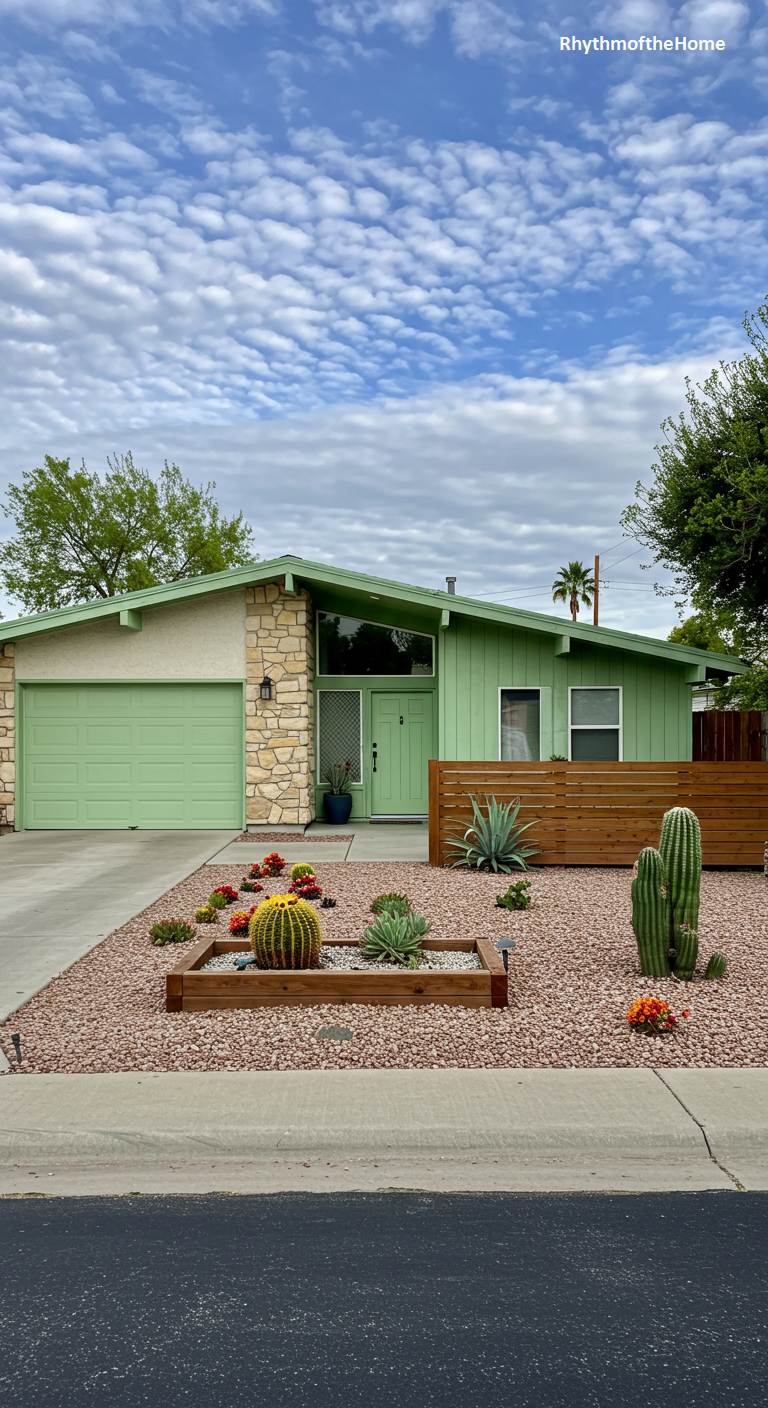 This updated Mid-Century home features a fresh and modern color palette. The facade is painted a soft, pistachio green, which works beautifully with the rustic, light-colored stone veneer accents. A low, horizontal wood fence adds a touch of warmth and contemporary style. The landscaping is a well-designed xeriscape, featuring reddish gravel and a raised planter bed made of wood. A variety of cacti and succulents add sculptural interest. The angled roofline and clean forms are classic MCM, given new life with a stylish, modern makeover.