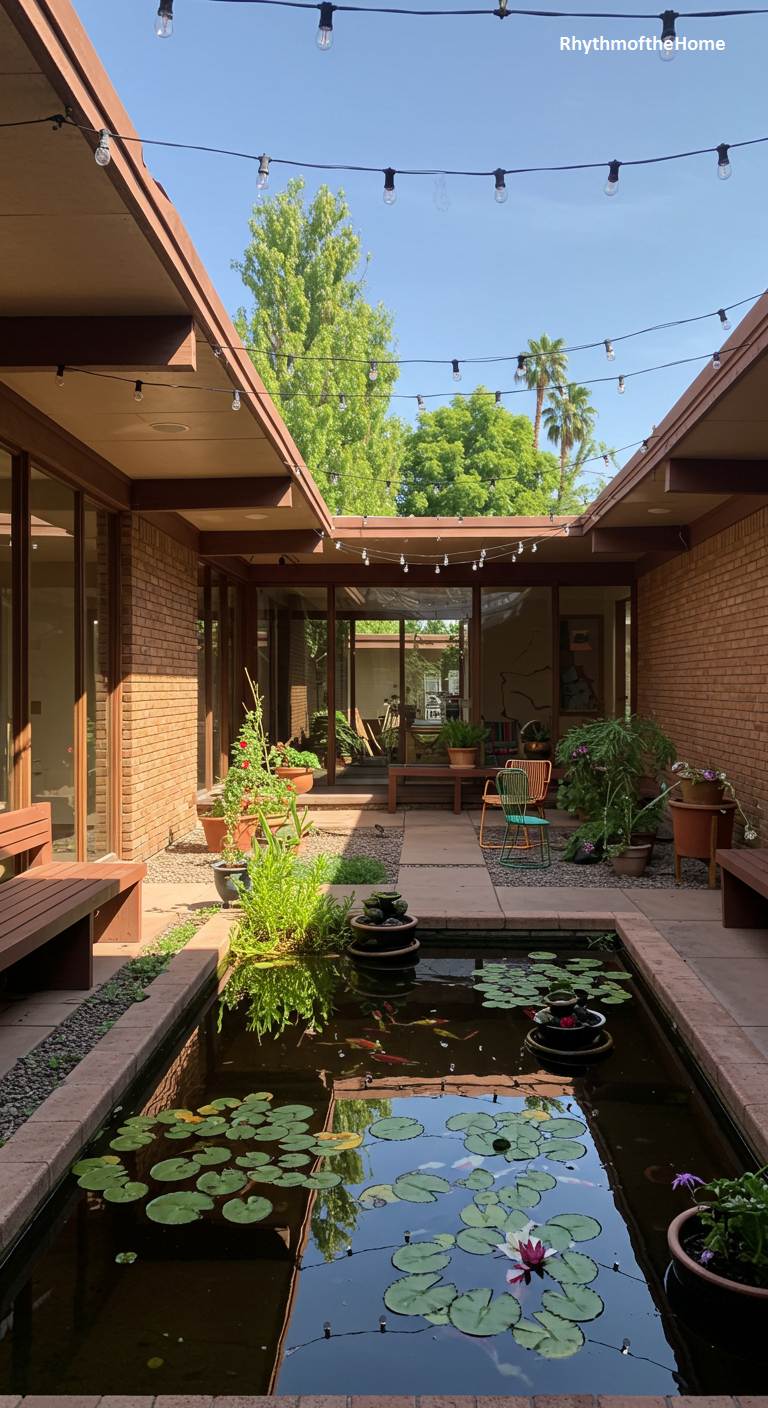 This U-shaped Mid-Century home is organized around a serene central atrium, creating a private oasis that blurs the line between inside and out. The exterior walls of warm, reddish-brown brick are complemented by dark-stained wooden beams and expansive glass panels that look into the courtyard. The atrium itself is a tranquil retreat, featuring a long, rectangular pond filled with lily pads and koi. String lights are draped overhead, suggesting magical evenings spent in this secluded haven, surrounded by the gentle sounds of water and the lushness of potted plants.