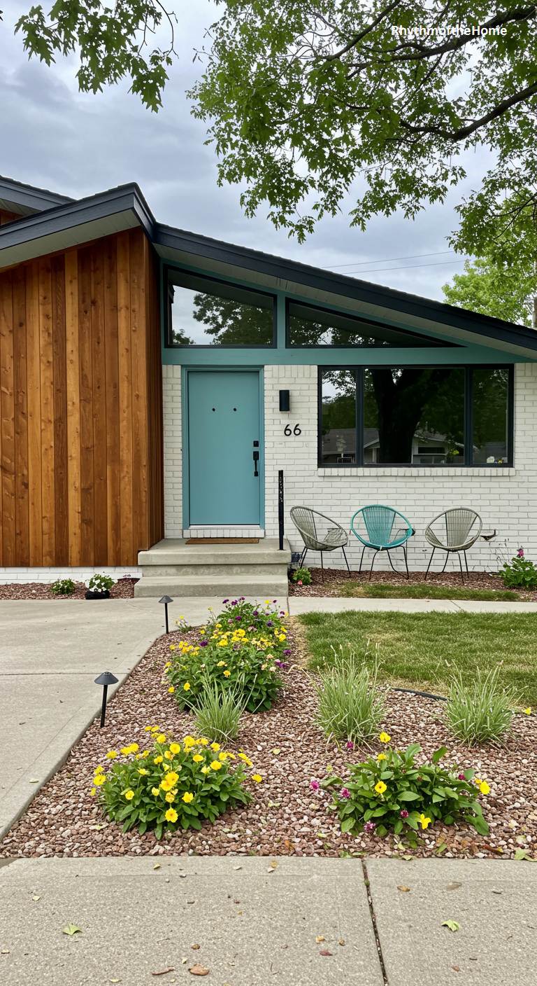 This beautifully renovated Mid-Century home is a study in pleasing contrasts. The crisp, white-painted brick provides a bright, clean backdrop for the stunning teal-colored front door. An accent wall of warm, vertical wood siding adds a rich, organic texture that balances the coolness of the teal and white. The classic angled roofline with clerestory windows is highlighted with dark trim. Two modern wire chairs on the porch invite relaxation, and the simple, neat landscaping with colorful flowers completes the picture of a stylish and welcoming home.