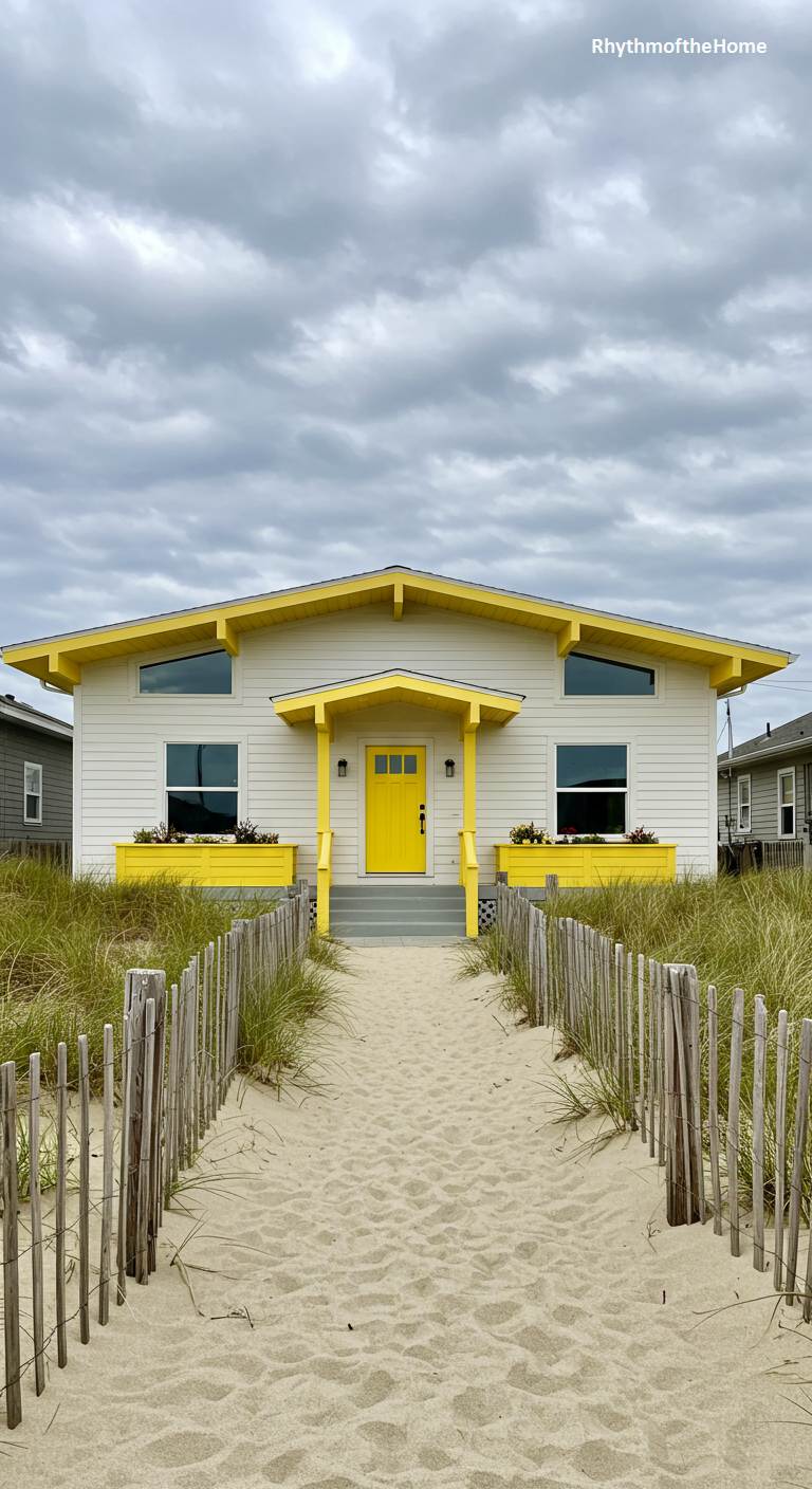 This adorable beach cottage is a sunny and cheerful take on Mid-Century design. The house is painted a clean white, with a vibrant, lemon-yellow used for the front door, the porch railings, and the charming window boxes. The simple, gabled form and trapezoidal windows give it a modern, slightly quirky character. A sandy path, flanked by a rustic wooden fence, leads directly from the beach to the front steps. This is the perfect, unpretentious, and happy retreat for a seaside getaway.