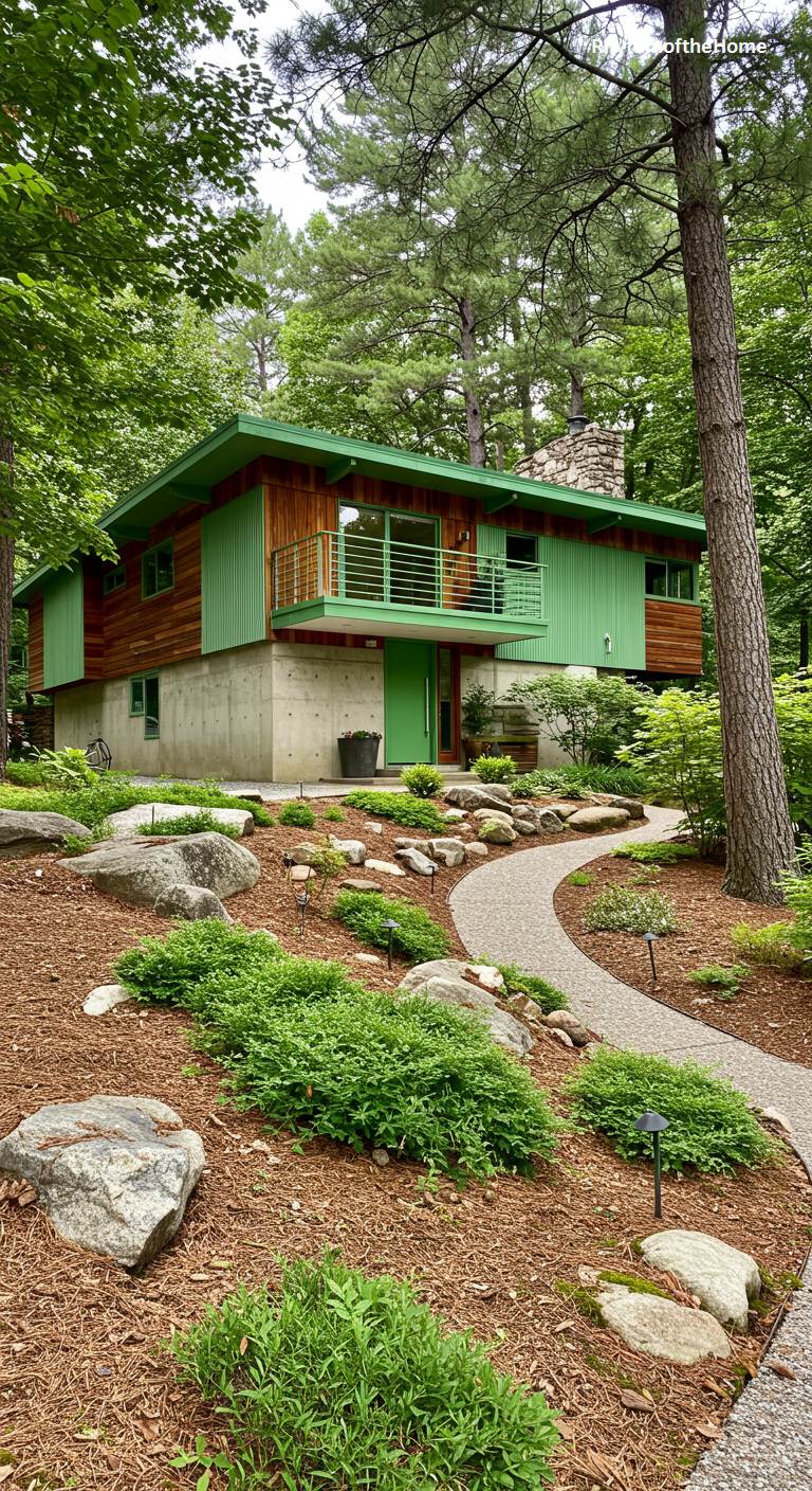 This unique split-level Mid-Century home is a fascinating blend of industrial and organic elements. The lower level is made of raw, board-formed concrete, giving it a solid, modern-brutalist feel. The upper level, clad in a combination of green-painted and natural wood siding, adds a layer of warmth and color. A balcony with a simple green railing extends from the second floor. A gracefully curving paved path winds up the hill through a naturalistic landscape of mulch, rocks, and low-growing shrubs, creating a beautiful journey to the green front door.