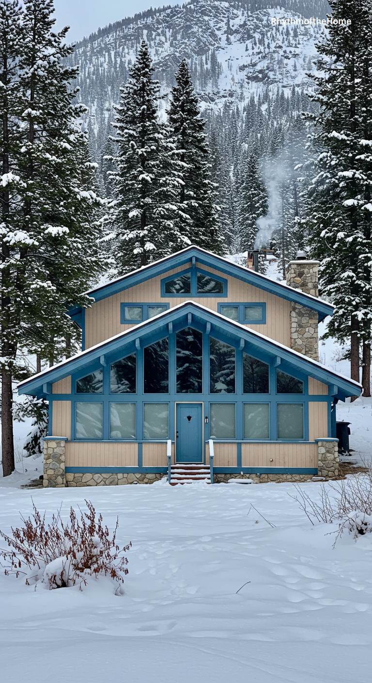 In a picturesque winter scene, this A-frame cabin stands as a cozy sanctuary against a backdrop of snow-covered mountains and pine forests. The home has a classic chalet feel, with its soaring roofline and large, multi-paned glass facade designed to capture the winter wonderland outside. The light-colored siding is accented with a lovely shade of dusty blue on the trim and the heart-adorned front door, adding a touch of whimsical charm. Smoke gently curling from the chimney promises warmth and comfort within this idyllic, snowy mountain retreat.