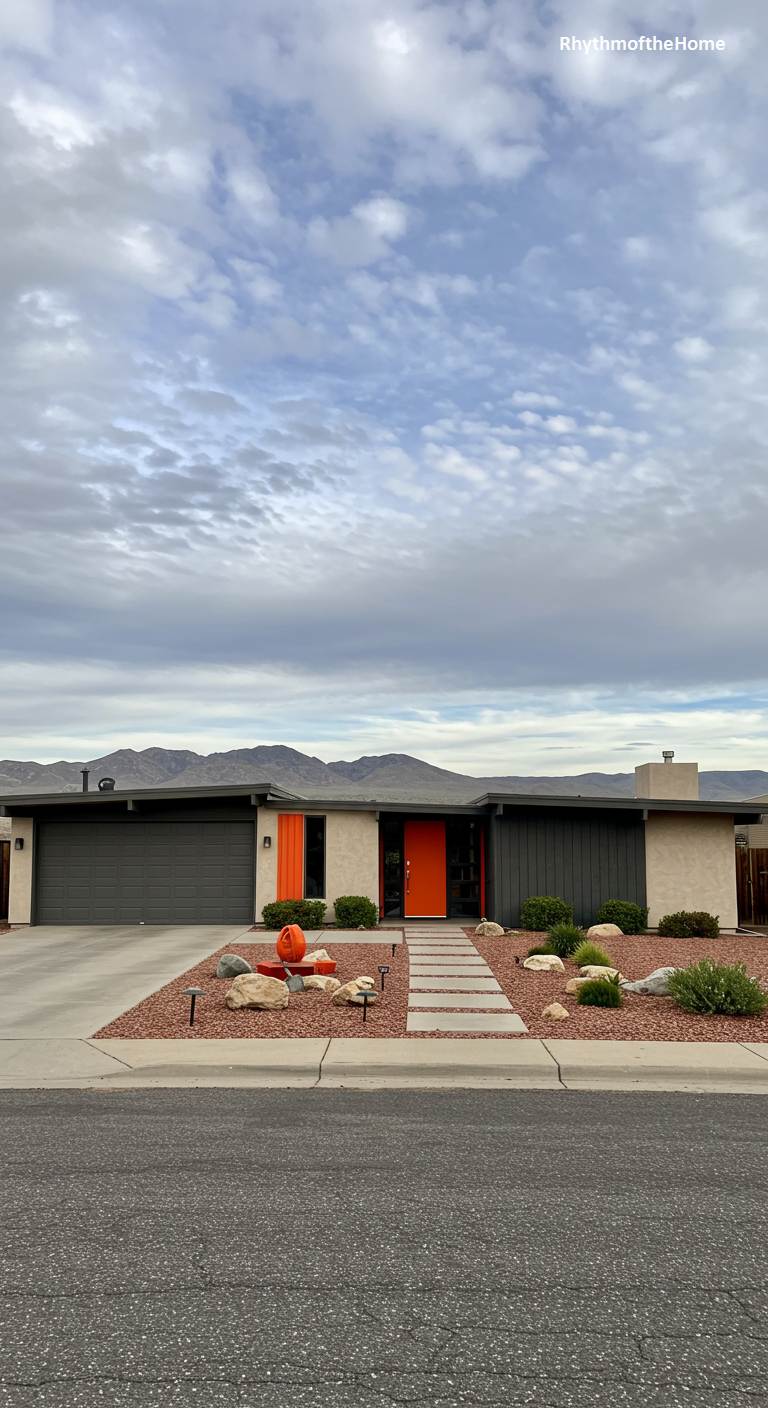 This stylishly updated Mid-Century home demonstrates the power of a single, bold accent color. The house has a sophisticated, neutral palette of dark gray and beige stucco, with a low-slung roofline and integrated garage. The design is electrified by a brilliant, fiery orange front door and matching side panel, creating a stunning focal point. The xeriscaped front yard with its reddish gravel, rocks, and shrubs is minimalist and modern, allowing the architecture and its pop of color to take center stage. An orange pumpkin sculpture adds a playful, seasonal touch.