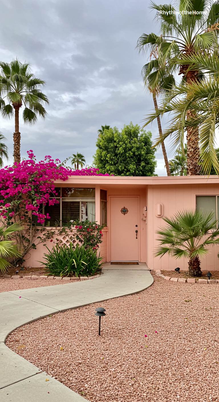This charming Palm Springs bungalow is a dreamy, retro fantasy in pink. The entire exterior is painted a soft, pastel pink, creating a warm and inviting look against the desert landscape. A flowering bougainvillea with vibrant magenta blossoms climbs up one side, adding another layer of color. The landscaping is a simple mix of pinkish gravel and a variety of palms and other desert plants. A curved walkway leads to the front door, which features a decorative, mid-century style escutcheon. This is a home that fully embraces a fun, whimsical, and colorful aesthetic.