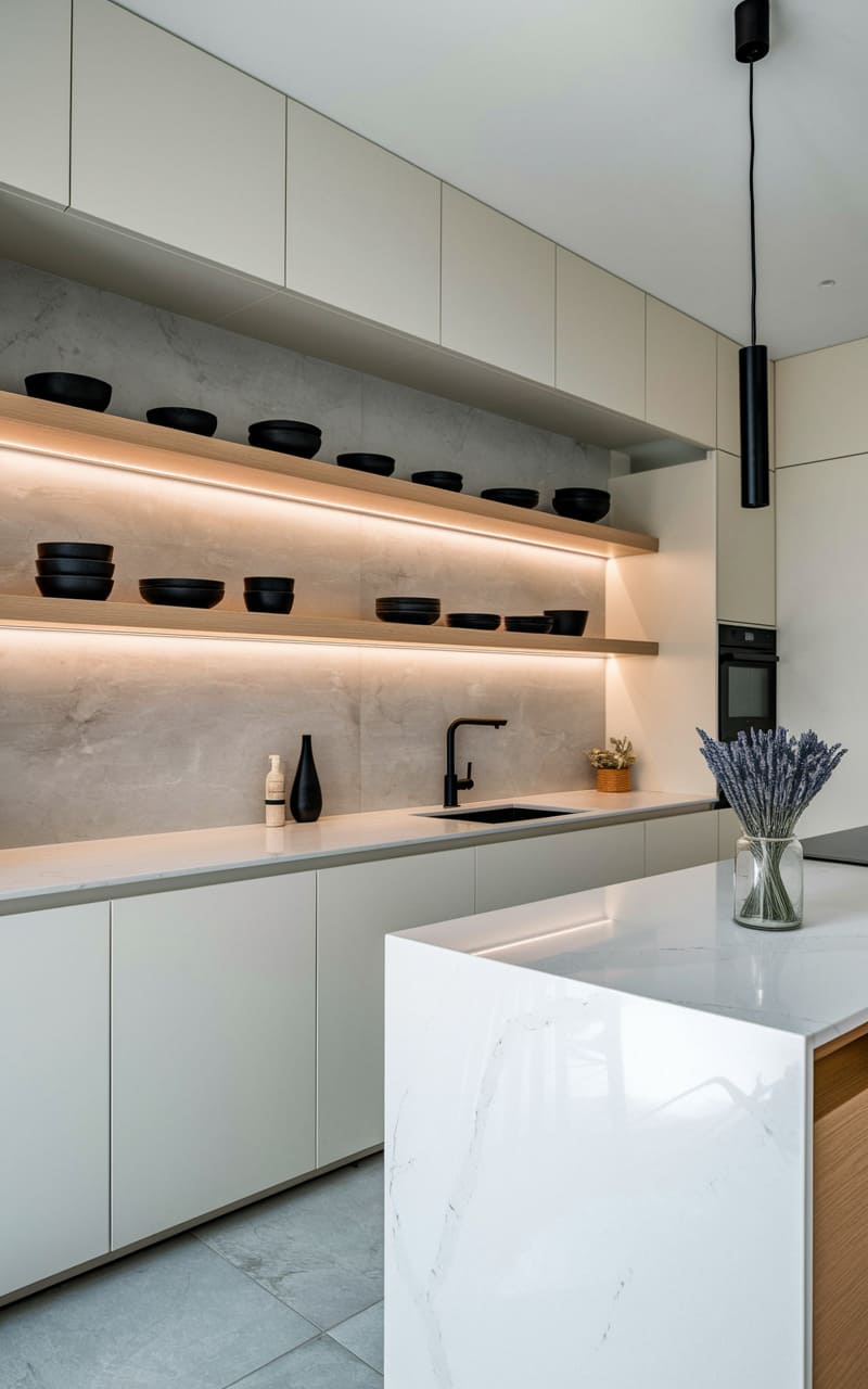 Sunlight spills across the cool expanse of this kitchen, where sleek, handleless cabinets in a whisper of cream meet a polished marble island, its facets catching the light like a freshly cut gem. A dark, slender faucet stands sentinel above a black sink, while a single, dramatic pendant hangs like a punctuation mark in the serene space. The open shelves, backlit with a warm glow, display a curated collection of matte black bowls, a stark contrast to the soft palette, hinting at a quiet, understated elegance.