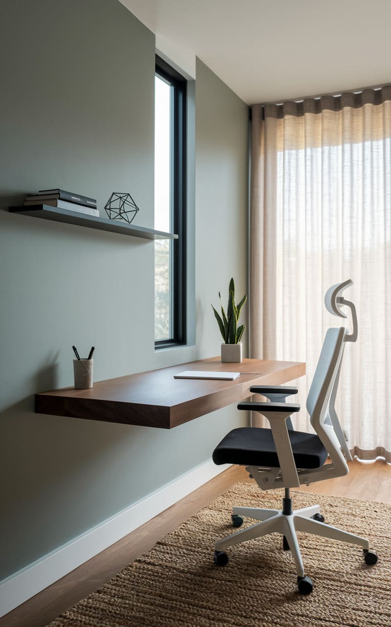 A study in clean lines and quiet focus, this workspace features a floating walnut desk anchored to a muted sage wall, a single plant mirroring the geometric shelf above. A sleek, ergonomic chair stands poised against a backdrop of soft, diffused light filtering through sheer drapes, all grounded by the textured warmth of a woven rug.