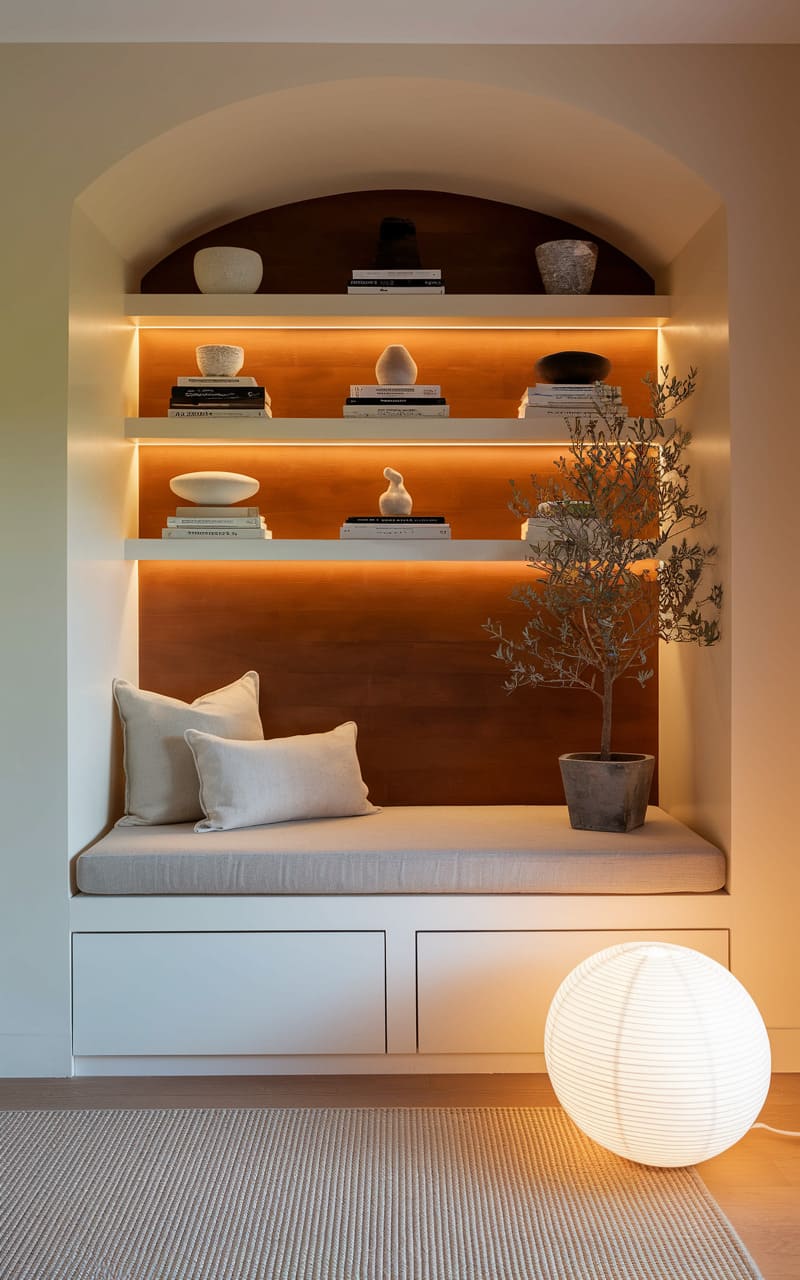 A serene alcove, carved into a pale wall, cradles a plush, dove-gray bench seat, inviting quiet contemplation. Soft, warm illumination emanates from behind floating shelves displaying curated objects, casting a gentle glow against the textured backdrop. Below, simple drawers anchor the space, while a spherical paper lantern radiates a calming light, mirroring the rounded arch above. A small, potted olive tree adds a touch of organic life to the minimalist composition, grounding the space in a tranquil, almost monastic simplicity.