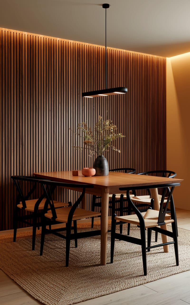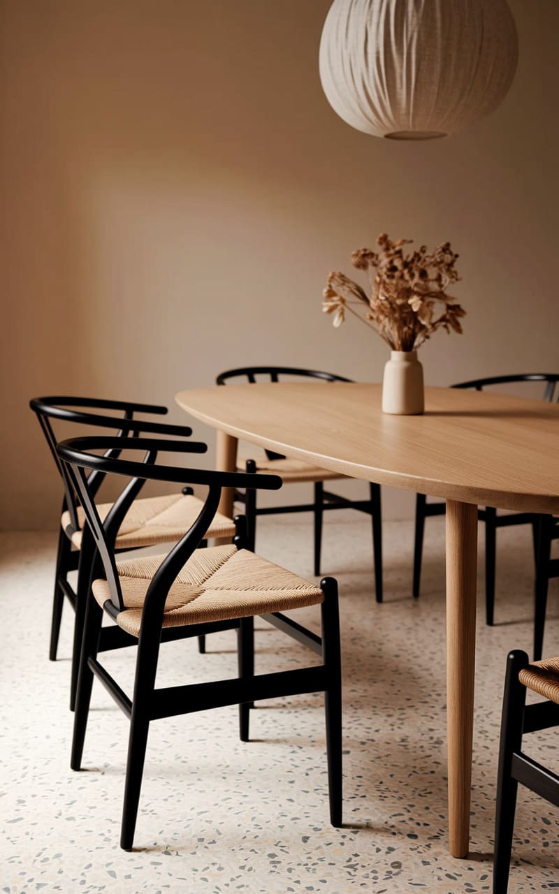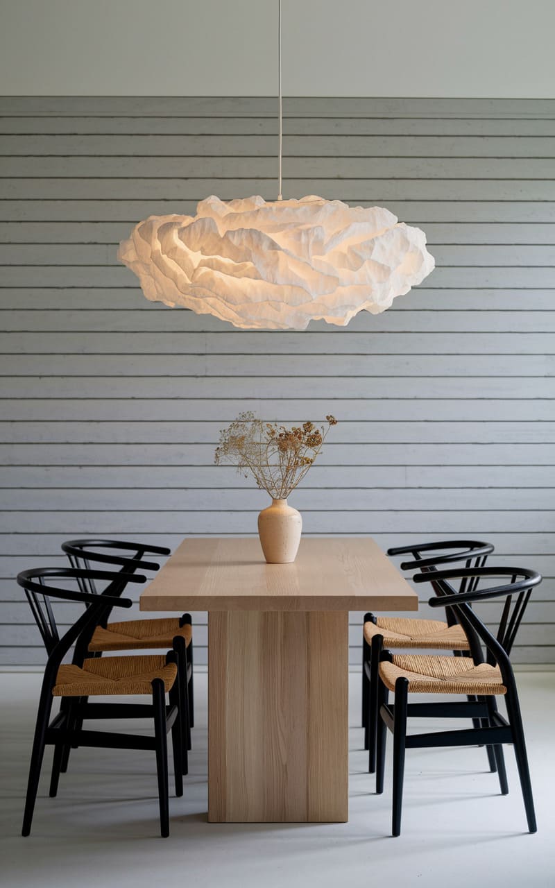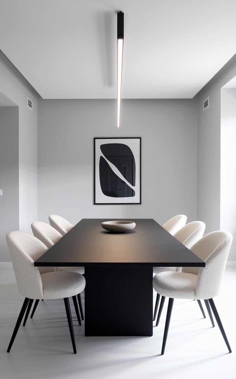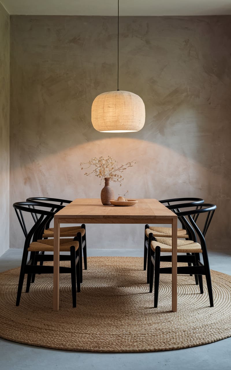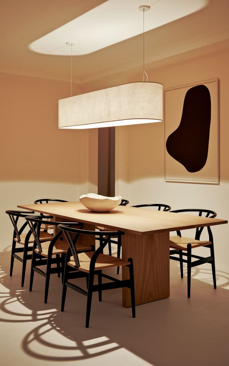 A whisper of light spills from a rectangular pendant, illuminating the clean lines of a wooden dining table and its ensemble of wishbone chairs. A solitary, abstract artwork hangs on the wall, its dark form echoing the shadows cast by the furniture, while a sculptural bowl rests like a quiet centerpiece. The entire scene hums with a serene, almost monastic simplicity.